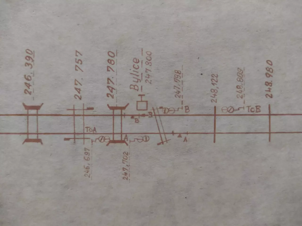 Posterunek odstępowy Bylice, położony w km 247,800 linii Katowice - Tczew (szlak Borysławice - Lipie Góry). Skan fragmentu szkicu sytuacyjnego odcinka Zduńska Wola Karsznice - Lipie Góry, wykreślony przez pracowników Zarządu Zabezpieczenia Ruchu i Łączności Północnej DOKP w Gdańsku. Stan na dzień 20 lutego 1965 roku.