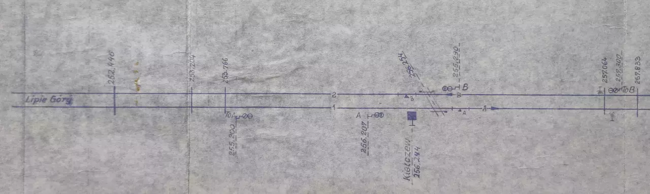 Posterunek odstępowy Kiełczew, położony w km 256,244 linii Katowice - Tczew (szlak Lipie Góry - Babiak). Skan fragmentu szkicu sytuacyjnego odcinka Lipie Góry - Inowrocław, wykreślony przez pracowników Zarządu Zabezpieczenia Ruchu i Łączności Północnej DOKP w Gdańsku. Stan na dzień 27 stycznia 1965 roku.