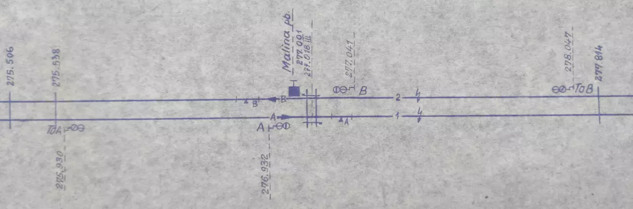 Posterunek odstępowy Malina, położony w km 277,001 linii Katowice - Tczew (szlak Zaryń - Piotrków Kujawski). Skan fragmentu szkicu sytuacyjnego odcinka Lipie Góry - Inowrocław, wykreślony przez pracowników Zarządu Zabezpieczenia Ruchu i Łączności Północnej DOKP w Gdańsku. Stan na dzień 27 stycznia 1965 roku.