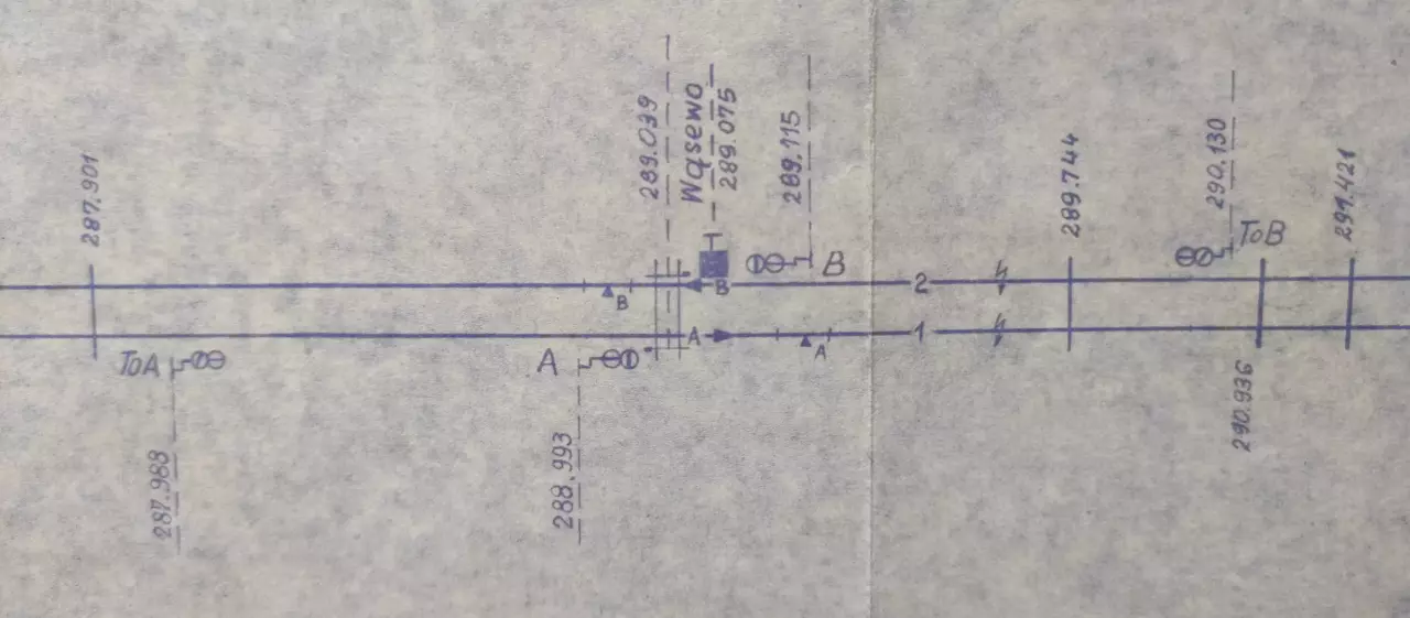 Posterunek odstępowy Wąsewo, położony w km 289,075 linii Katowice - Tczew (szlak Piotrków Kujawski - Chełmce). Skan fragmentu szkicu sytuacyjnego odcinka Lipie Góry - Inowrocław, wykreślony przez pracowników Zarządu Zabezpieczenia Ruchu i Łączności Północnej DOKP w Gdańsku. Stan na dzień 27 stycznia 1965 roku.