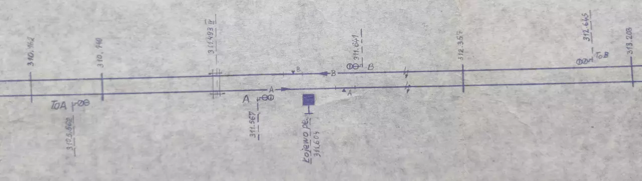 Posterunek odstępowy Łojewo, położony w km 311,604 linii Katowice - Tczew (szlak Karczyn - Inowrocław Rąbinek). Skan fragmentu szkicu sytuacyjnego odcinka Lipie Góry - Inowrocław, wykreślony przez pracowników Zarządu Zabezpieczenia Ruchu i Łączności Północnej DOKP w Gdańsku. Stan na dzień 27 stycznia 1965 roku.