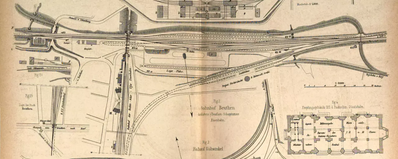 Plan bytomskich stacji OSE i ROUE z książki "Handbuch für specielle Eisenbahn-Technik, Leipzig 1870". Fig 2b to północna część stacji ROUE, fig 2a wschodnia OSE. Uwaga: orientacja mapy odwrócona (południowa).