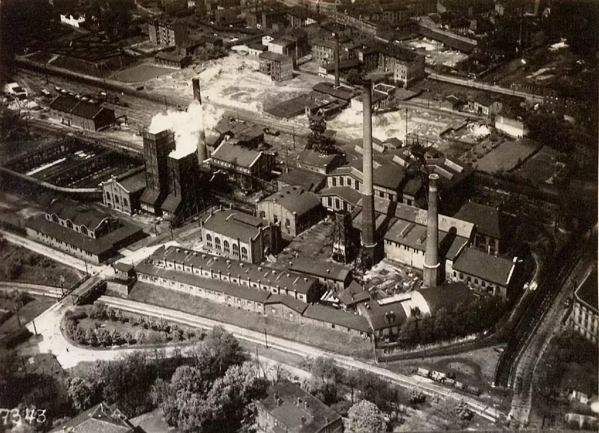 Zdjęcie lotnicze kopalni Rozbark. Tor GKW w wykopie. W prawym dolnym rogu przejazd i trójkąt torowy umożliwiający jazdę w kierunku Warsztatów GKW lub stacji Rozbark. Widoczny również tunel tramwajowy na Chorzowskiej oraz "Węglówka". Źródło: "Blei und Zinkerzbergwerk Deutsch-Bleischarley-Grube Beuthen O/S".