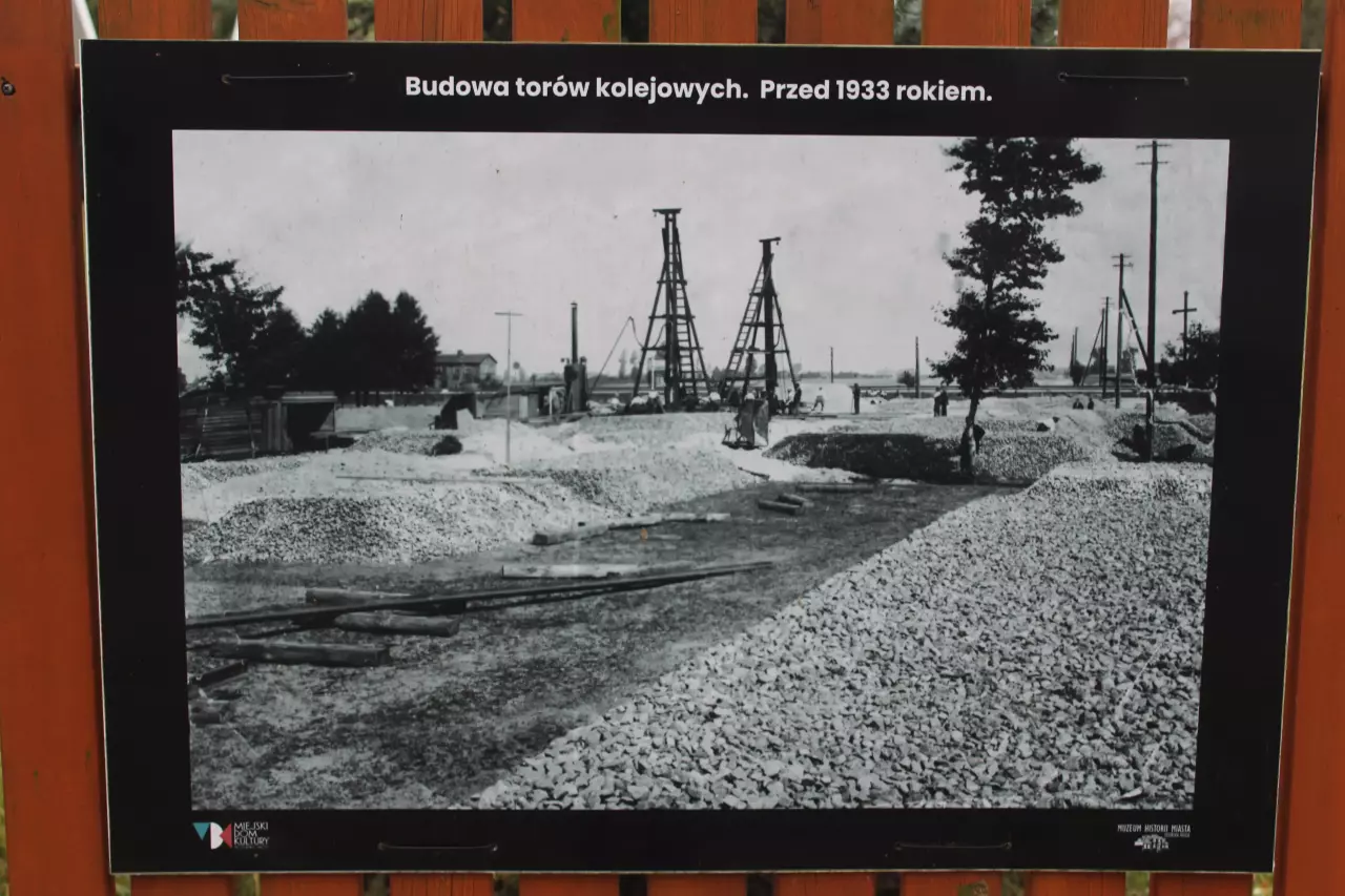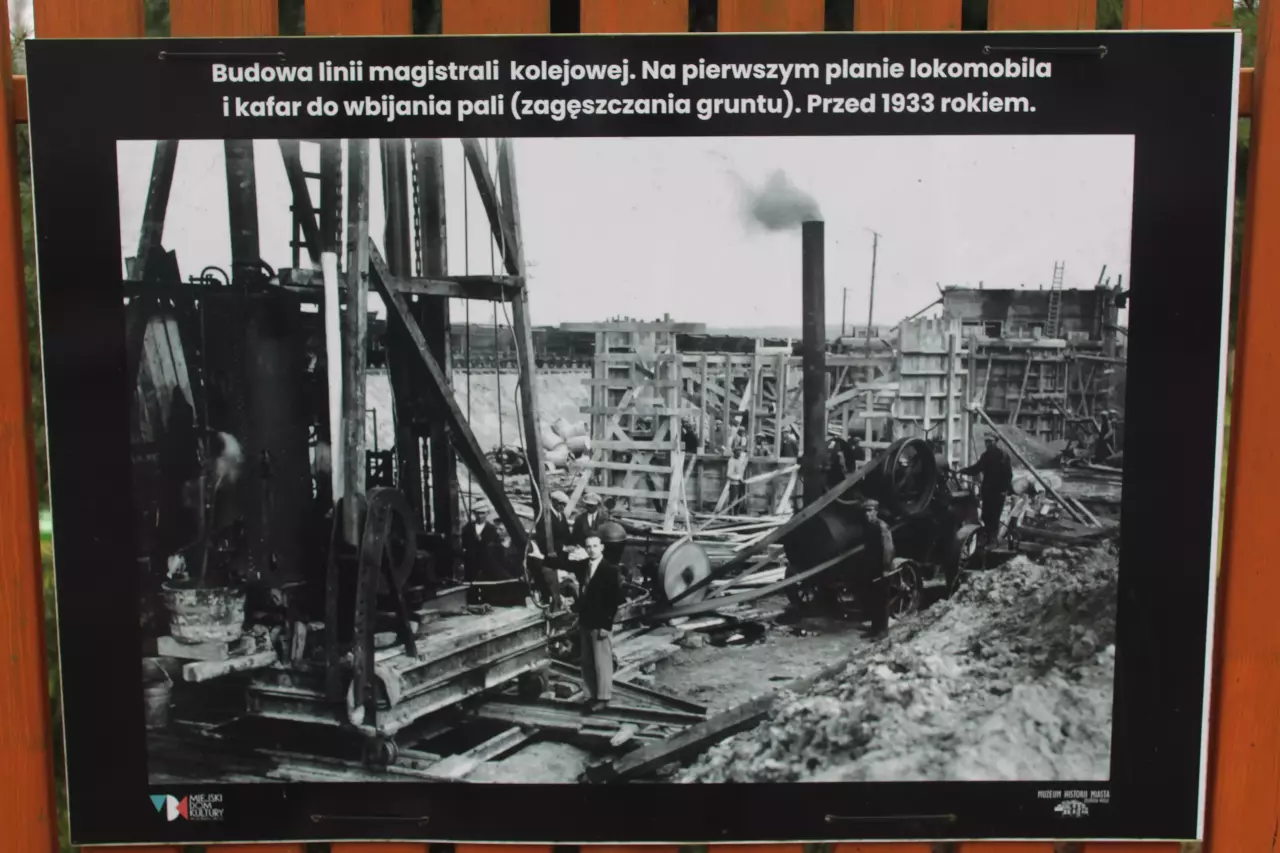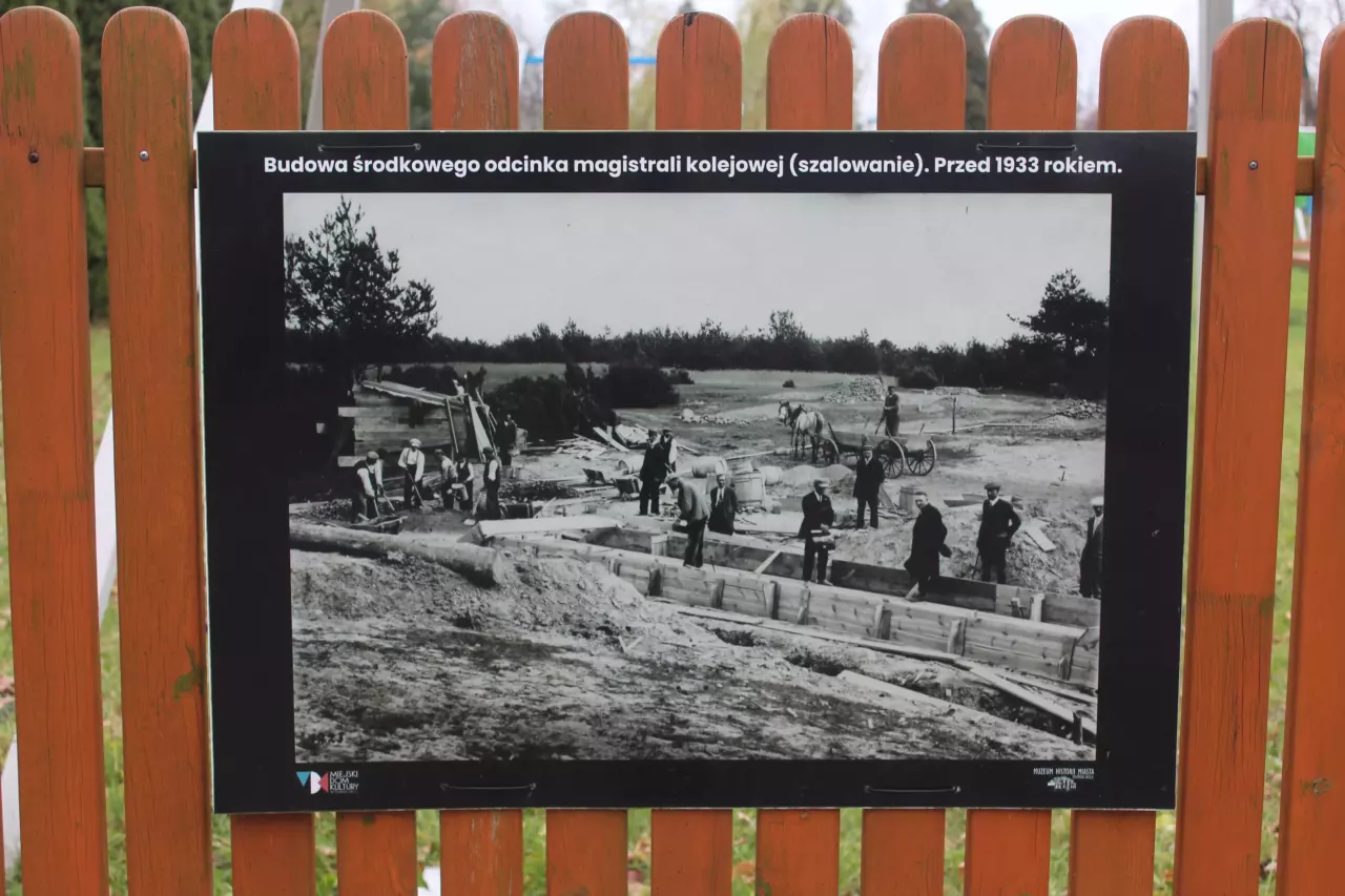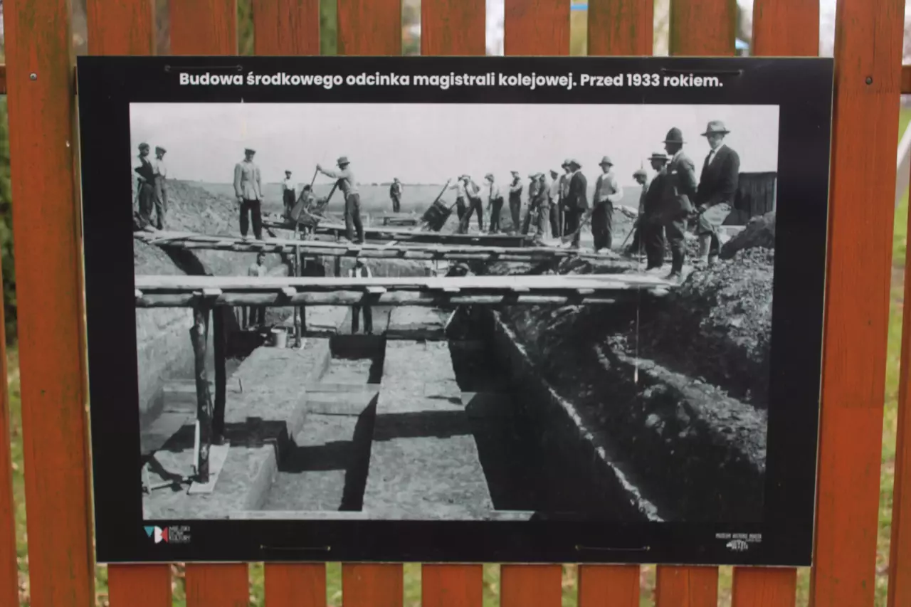 Jedna z kart, które umieszczono na płocie Miejskiego Domu Kultury w Zduńskiej Woli Karsznicach przy ulicy 1 Maja, nieopodal wiaduktu nieopodal Zakładu Taboru i Skansenu. Na karcie przedstawiono fotografię z budowy Magistrali Węglowej.