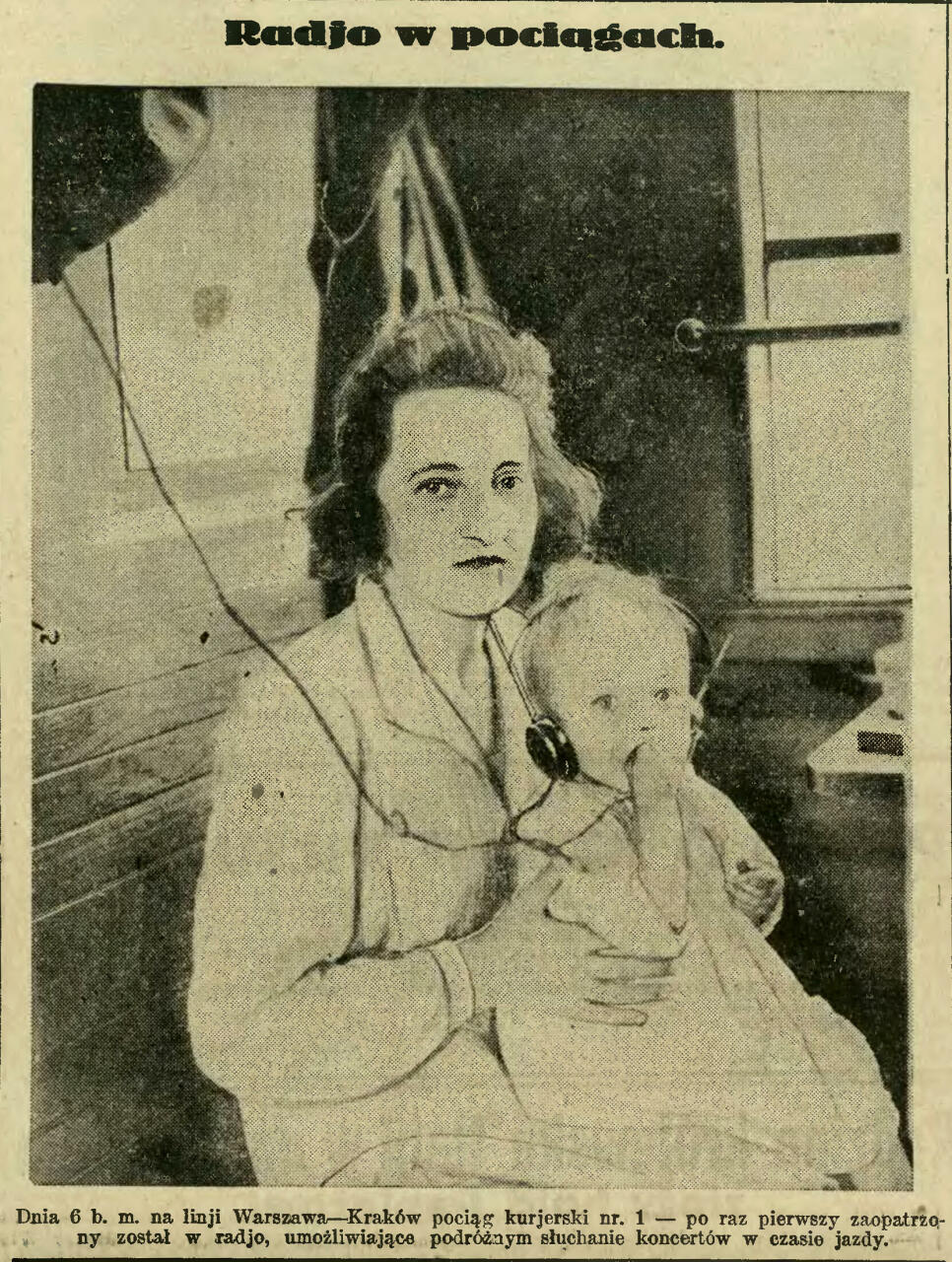 Fotografia z Ilustrowanego Kuryera Codziennego, z dn. 10 lipca 1929 r. przedstawiająca pierwsze zastosowanie radia w pociągu rozkładowym dla użytku podróżnych w dn. 6 lipca. Był to pociąg kurierski (posp.) nr 1 z Warszawy do Krakowa (Warszawa Główna, odjazd 15:05).