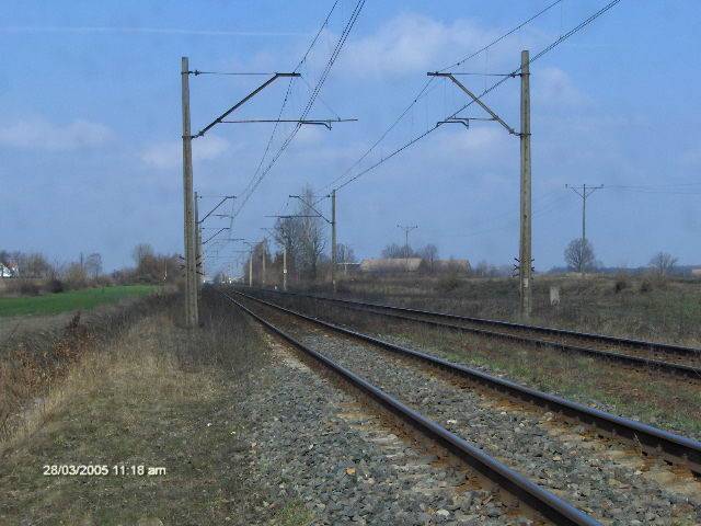 Widać rozebrany drugi tor między Oleśnicą a Bierutowem oraz prace i maszyny budowlane przy nim.