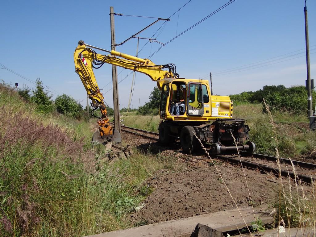 Przejazd drogowy obok ulicy Meliorantów. Tor nr 1 linii Wyczerpy - Chorzew Siemkowice. Z tyłu wiadukt kolejowy obok ulicy Meliorantów. Po lewej tor nr 2 linii Wyczerpy - Chorzew Siemkowice. Koparka Atlas 1604 K w trakcie prac. Widok w kierunku Zduńskiej Woli. 1,7 km.