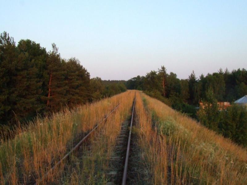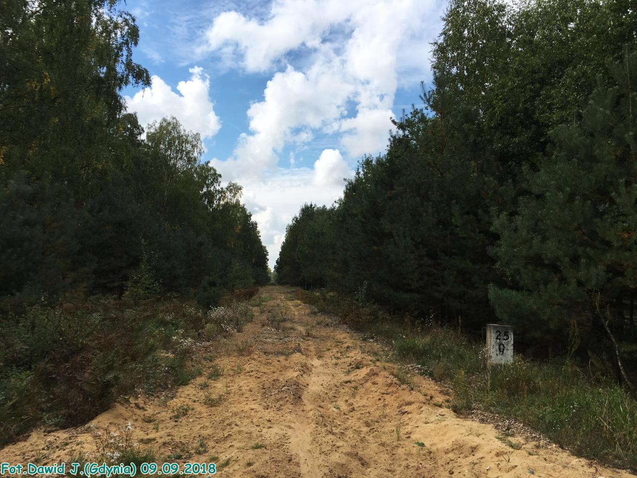 Widok z miejsca gdzie do 2017 roku były tory. 25,0 km linii, widok w kierunku stacji Wrocki. Tereny starotorza nie są przejezdne. Tereny te są pełne krzaków, gęstego piachu, kamyków, górek gruzu itp.