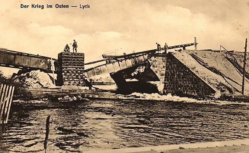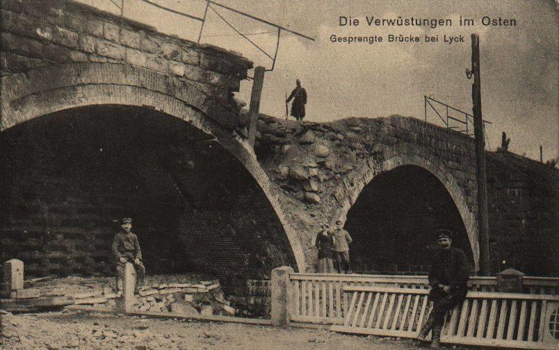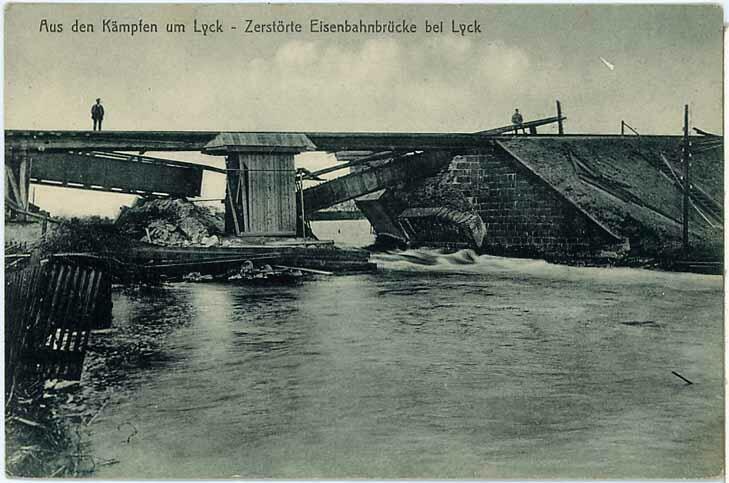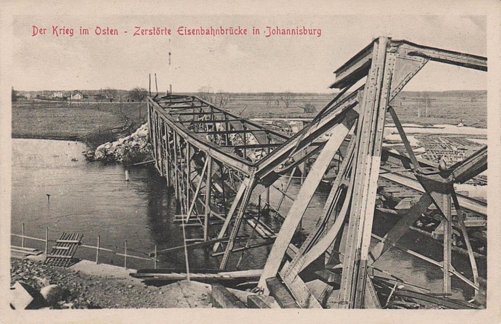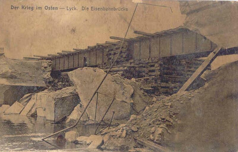 Zniszczony w czasie I WŚ most kolejowy w Piszu.