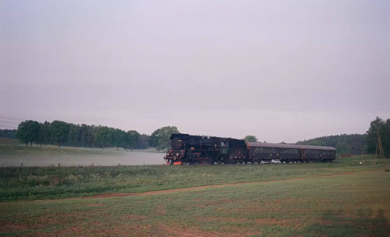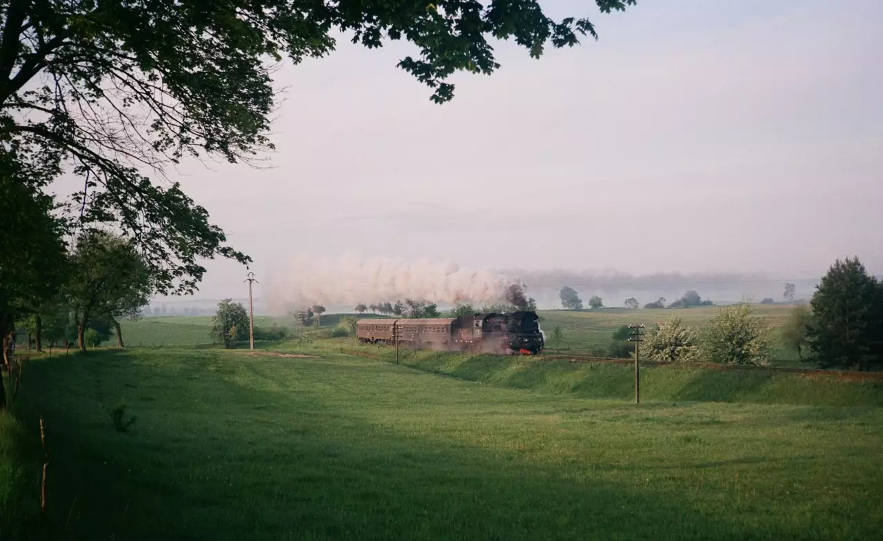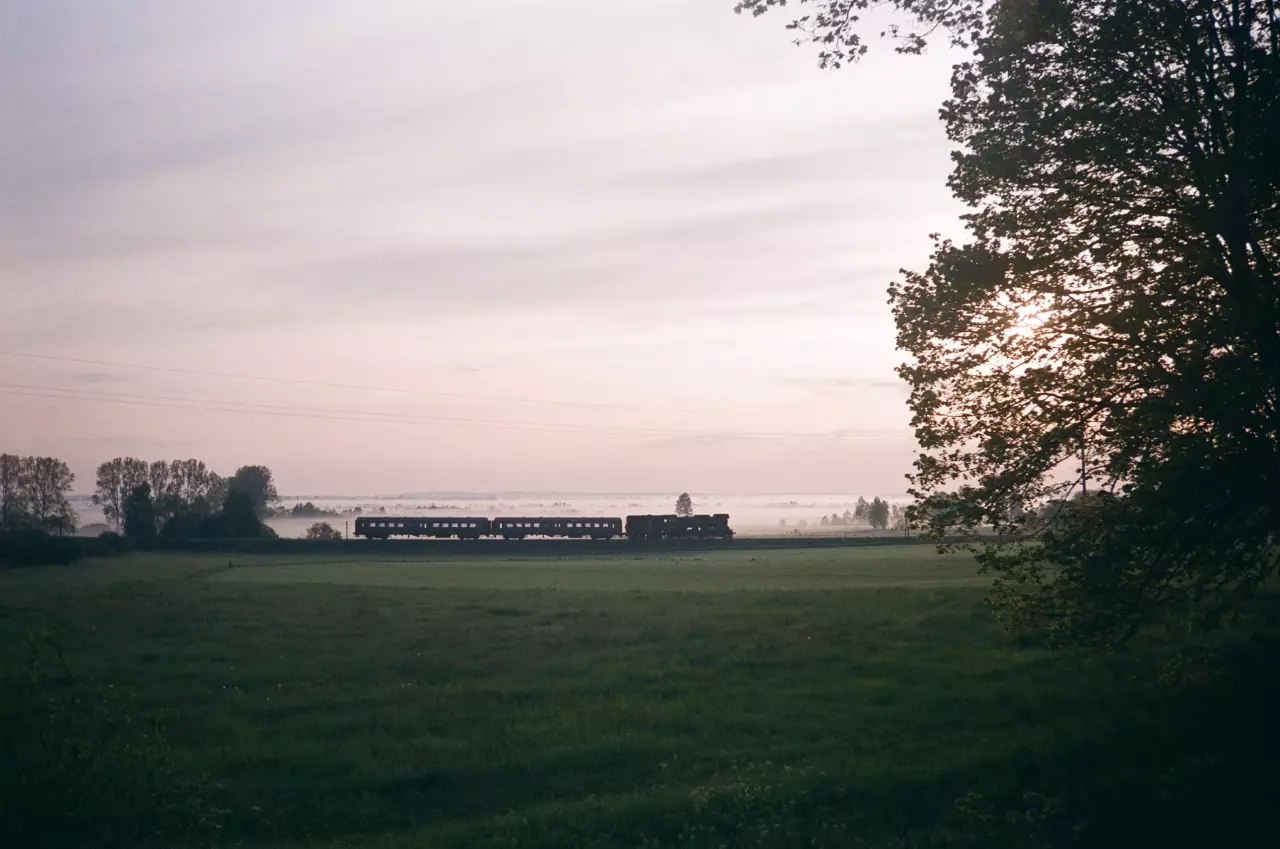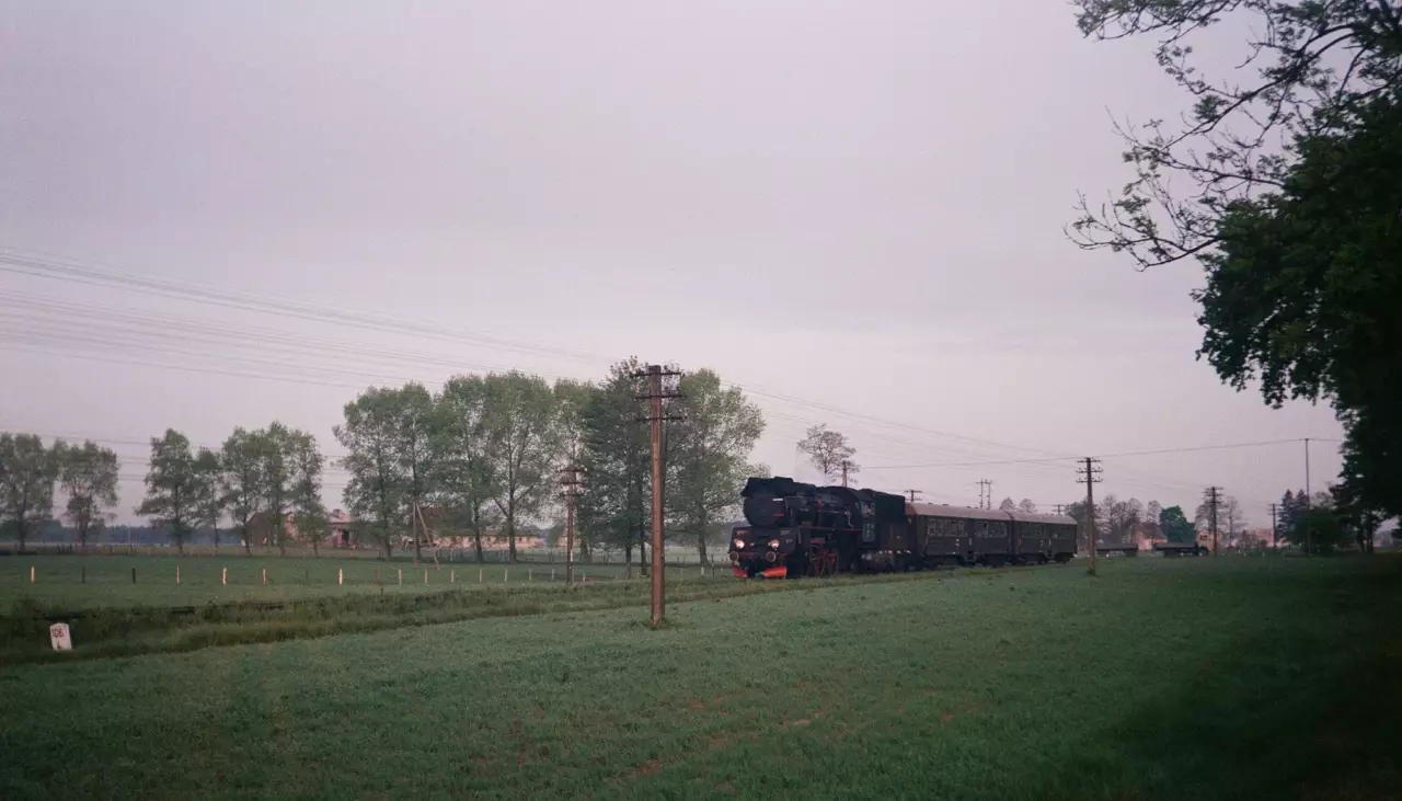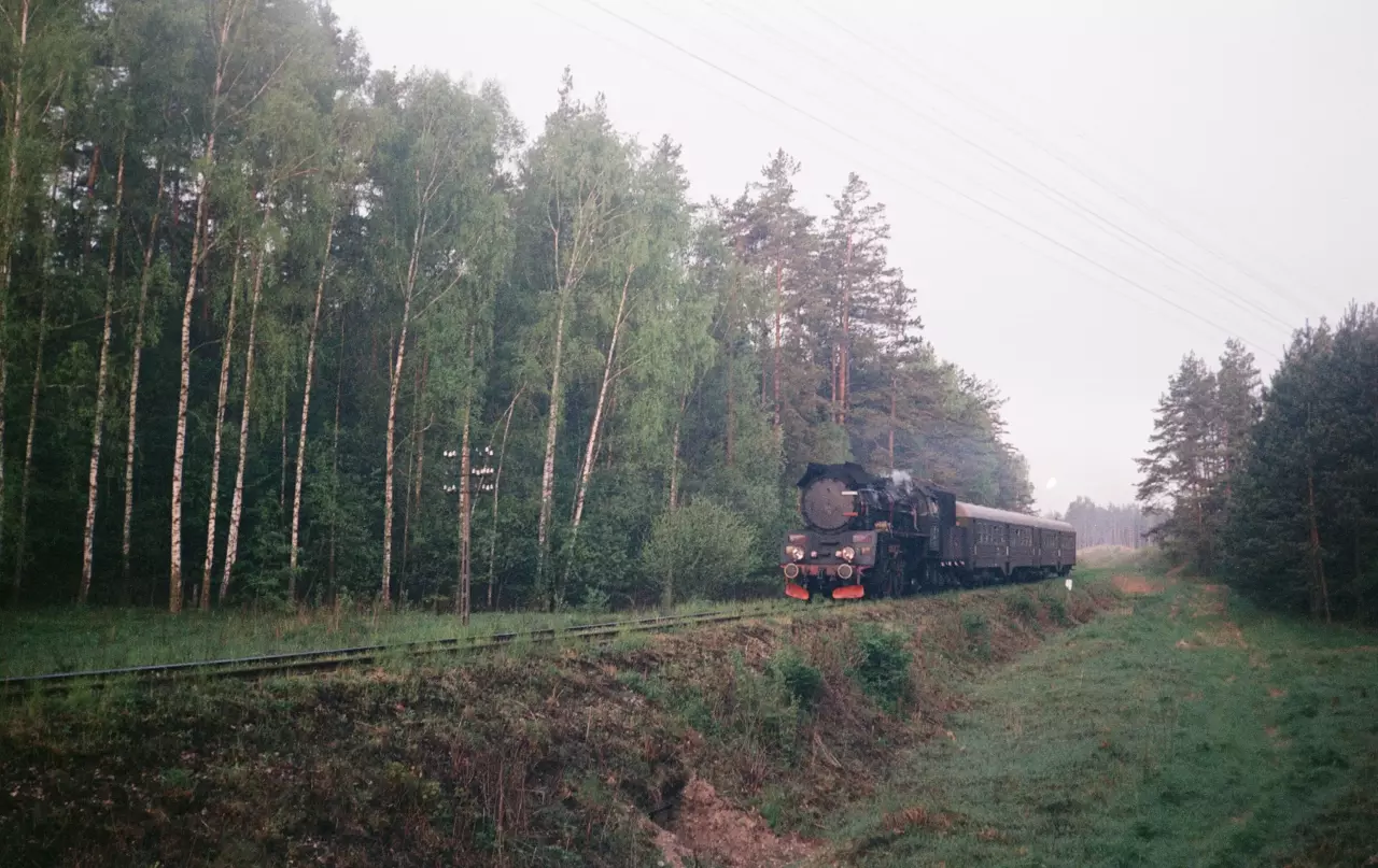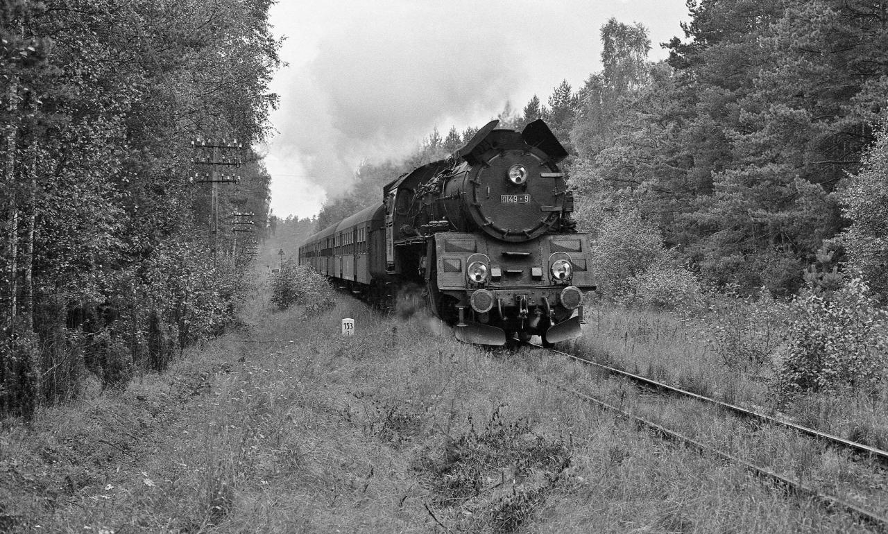 Km 106,4 linii nr 219 Olsztyn Główny - Ełk (odcinek Pisz Wschodni - Stare Guty), pociąg M 9631 relacji Pisz - Ełk, prowadzony parowozem Ol49-11 (MD Ełk), widok w kierunku stacji Szczytno (Olsztyn Główny).