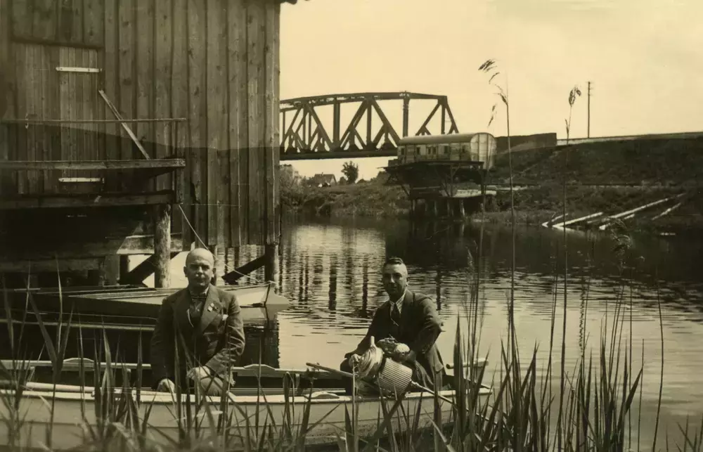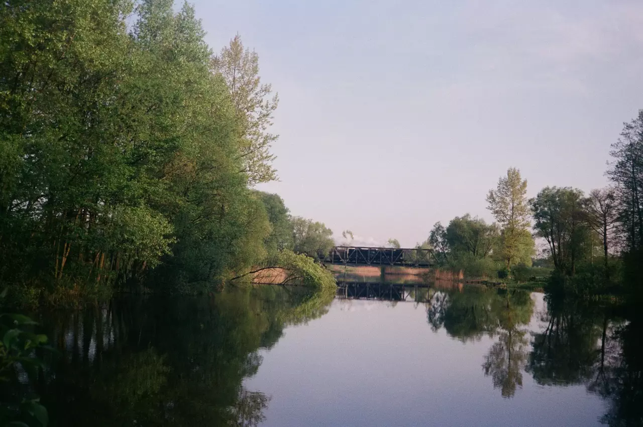 Przed mostem stoi wagon na dawnej bocznicy do bindugi. Tor ten wykorzystano do budowy mostu tymczasowego, po zniszczeniu mostu na nasypie.