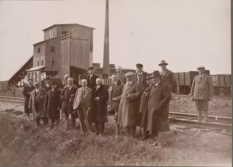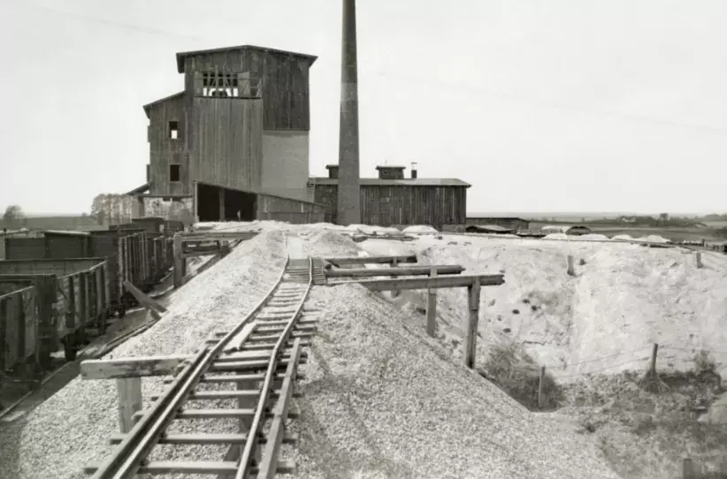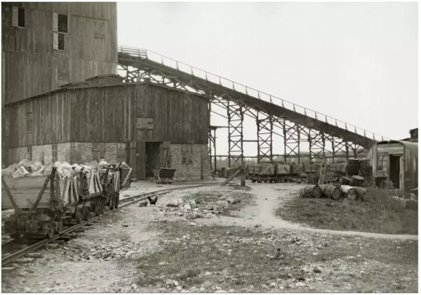 Widoczny w tle budynek można oglądać do dnia dzisiejszego. Mieściły się tam młoty i młyny do rozbijania kamienia. Ze zdjęć można również domniemywać, że bezpośrednio z budynku ładowane były wagony normalnotorowe.
