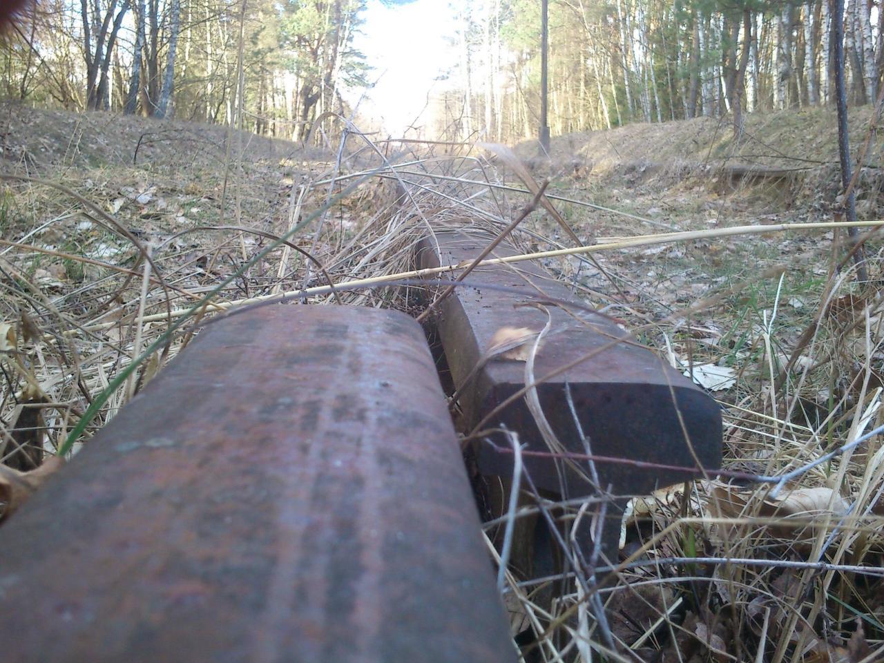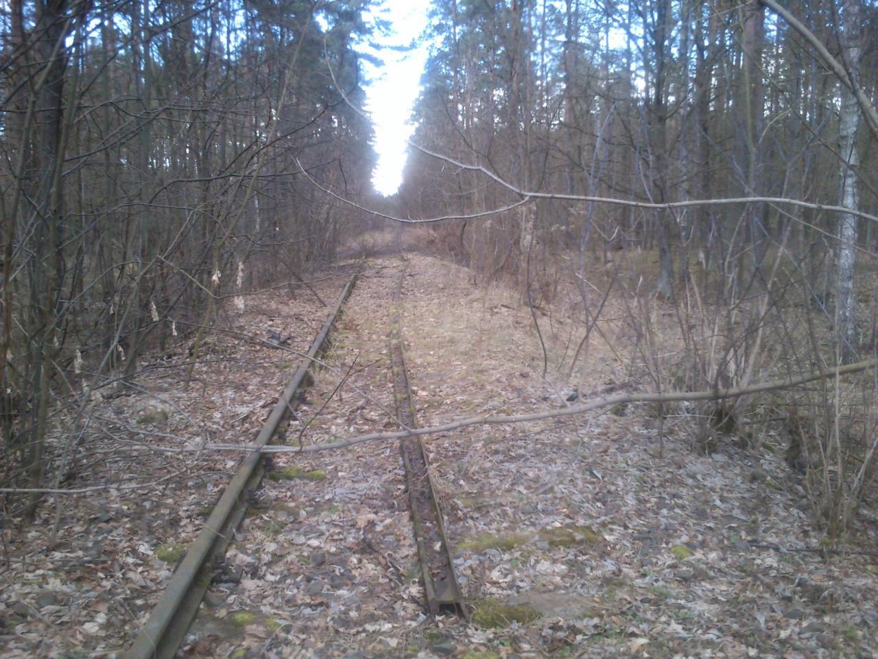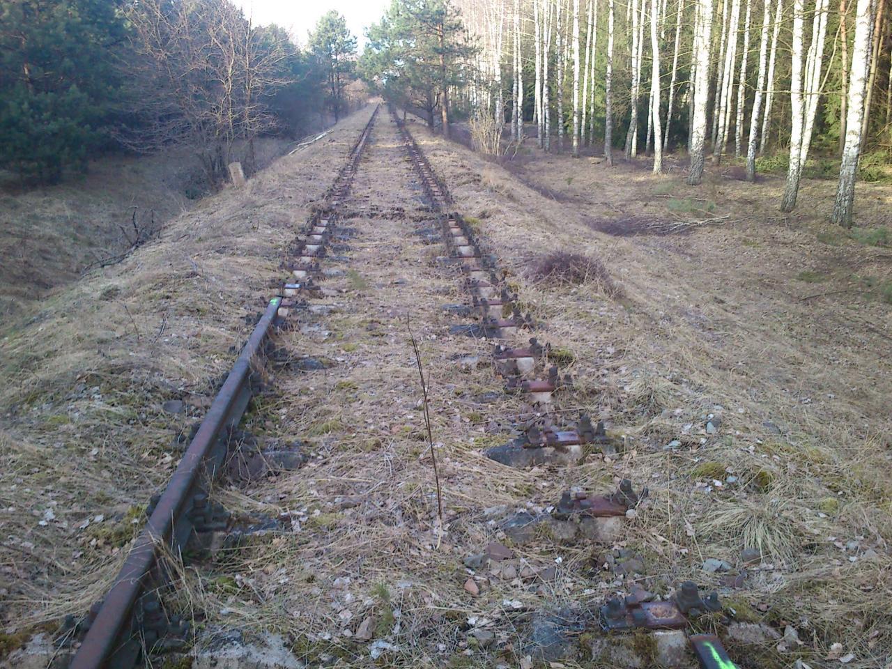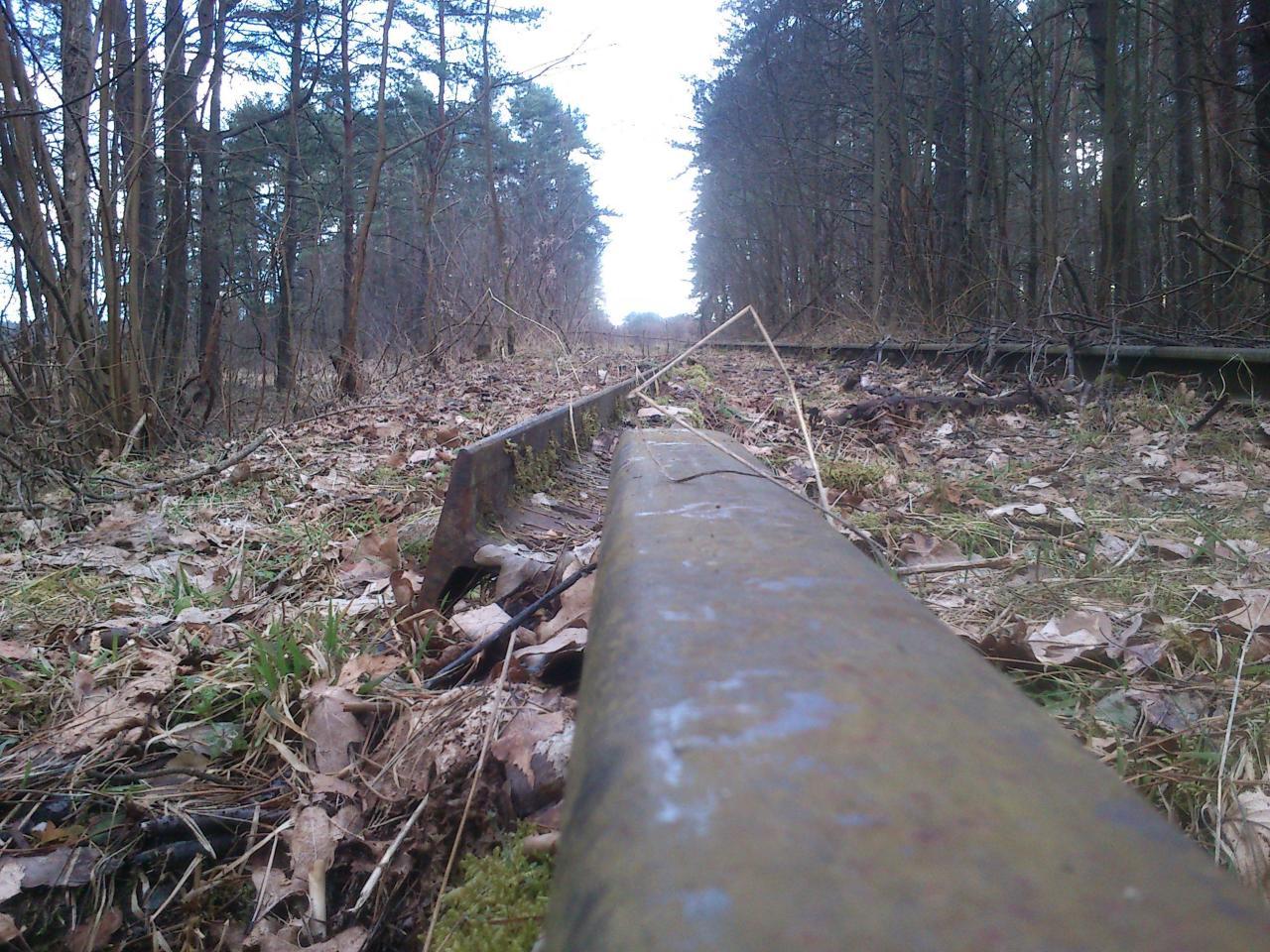 Linia Szczytno - Biskupiec Reszelski na obrzeżach Szczytna. Widok w kierunku Biskupca. Stan w tym miejscu nie najlepszy, ale nie tragiczny. Brakuje dość dużo śrub i nadleśnictwo w ciągłym ataku.