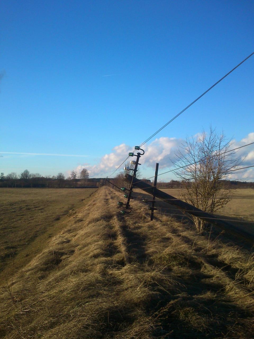 Przewrócony słup linii telefonicznej na początkowym odcinku linii Szczytno - Biskupiec Reszelski.