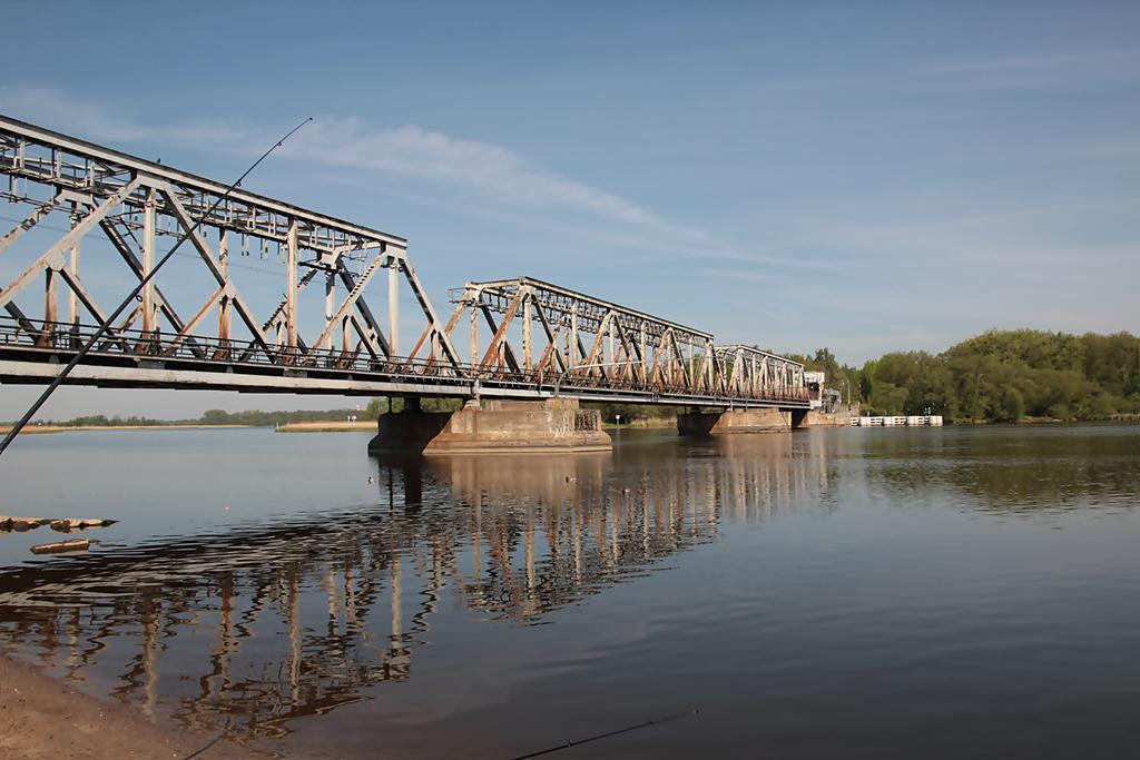 Most kolejowy nad Odrą pomiędzy Księginicami (w lewo) a Brzegiem Dolnym (w prawo). Widok w kierunku północno-zachodnim od strony nieczynnej nitki mostu.