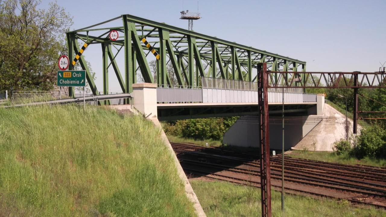 Wjazd na most od strony Księginic. Prawa nitka zamknięta i nieprzejezdna, lewa intensywnie użytkowana. Widok z pierwszego przęsła w kierunku północno-zachodnim (Brzeg Dolny). Okazałe przęsło nurtowe na czynnej nitce mostu budzi respekt.