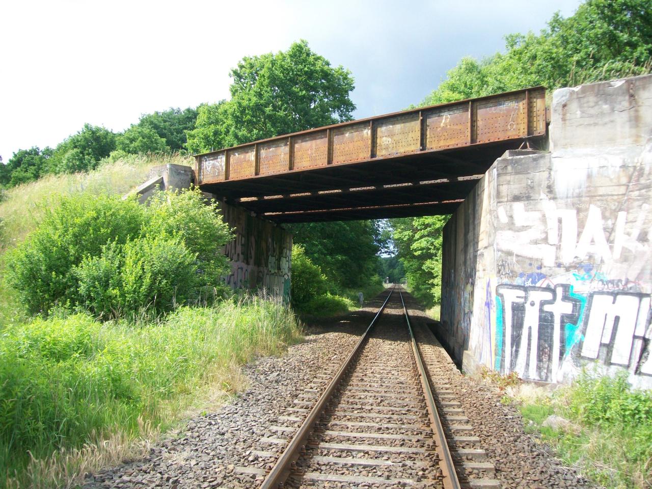 Wiadukt nad drogą poligonową w pobliżu JW 718, okolice km 144,3. Widok w kierunku południowo-wschodnim (Żagań). Mimo, że w pobliżu tereny wojskowe, złomiarzy bez problemu wycięli stalowe bariery.