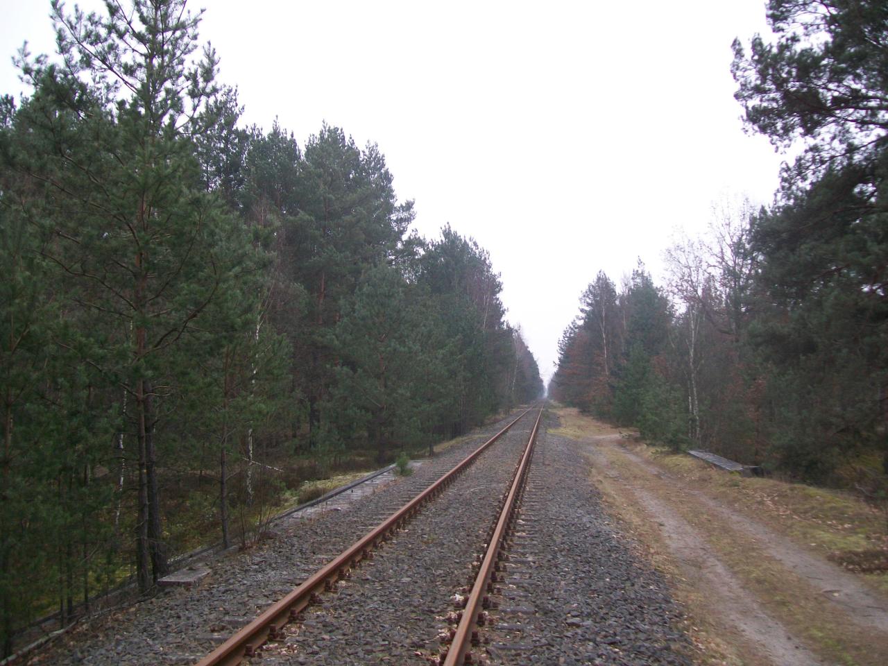 Berlinka w lesie między Mierkowem a Jasienicą Gubińską nie wygląda odcinkami jak opuszczona i rozebrana linia. Czysty, zagęszczony tłuczeń, równo ułożone podkłady strunobetonowe - tak jakby za chwilę miał tędy przejechać Plasser i układać szyny. Widok w kierunku Mierkowa/Lubska (południowy-wschód), z lewej strony widoczny ślad po zdemontowanym po II wojnie światowej drugim torze. Kilometr 180.