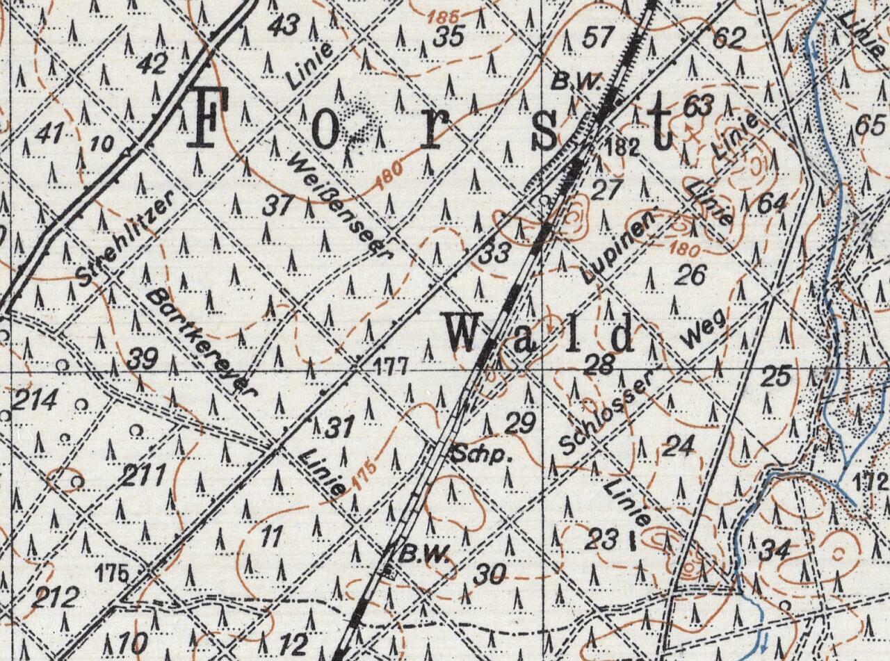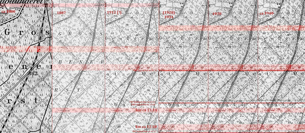 Zobrazowana w 1912 siedziba BW w km ca 13.10 na kolejnych arkuszach opisana jest już jako Schp. (szopa) - zapewne tutejszy Bahnwärter osiadł w nowym Bahnwärterhaus w km ca. 12.58, łączącym funkcje służbowe i mieszkalne oraz wyposażonym w budynek gospodarczy na niewielkiej działce. Zmianie tej towarzyszy zobrazowanie punktu eksploatacyjnego, chętnie identyfikowanego jako mijanka dzieląca relatywnie długi szlak.