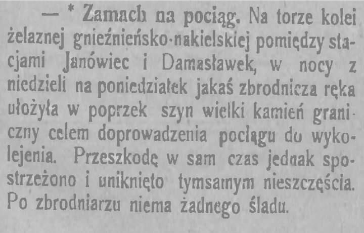 Informacja prasowa o nieudanej próbie wykolejania pociągu na linii kolejowej Gniezno - Nakło.