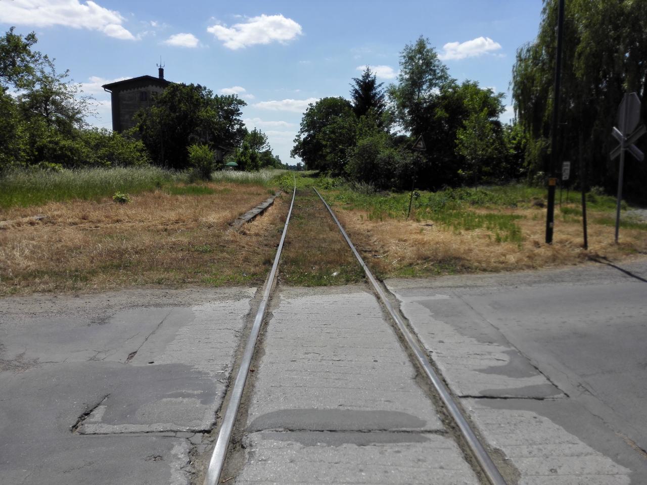 Domasław, przejazd kolejowy na ulicy Tynieckiej. W tle budynek stacji Domasław. Widok od strony Wrocławia.