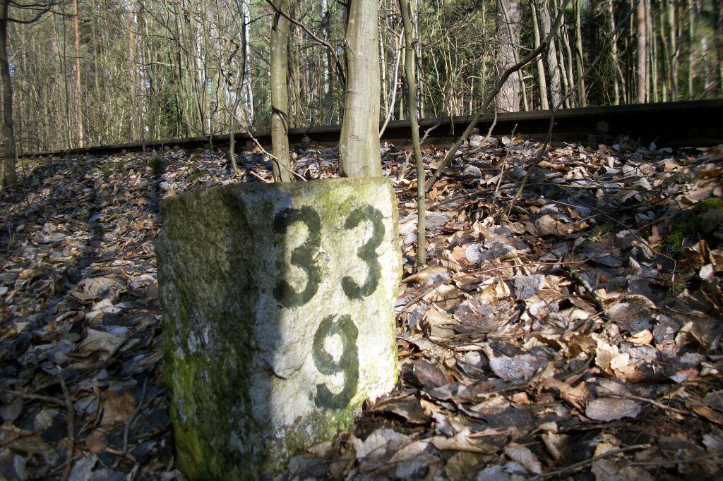 Słupek hektometryczny 33.9 między stacjami Pokój i Okoły.