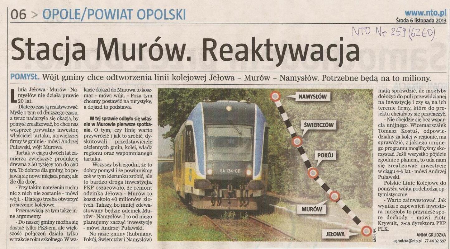 Wójtowie gmin przez które przebiega linia kolejowa z Jełowej do Namysłowa są za reaktywacją lini. Na razie to tylko wstępne plany, choć nigdy nie wiadomo… Artykuł z dnia 6.11.2013 r. Źródło: Nowa Trybuna Opolska, nr 259 (6260).