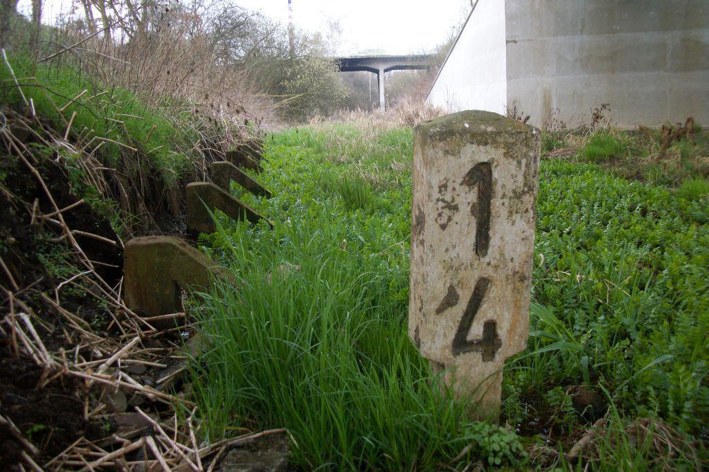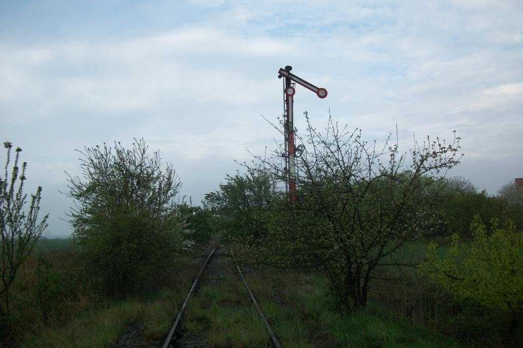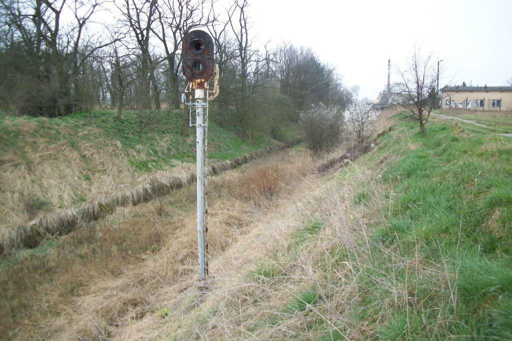 Słupek hektometryczny przed wjazdem na stacje w Namysłowie. Dawnym torowiskiem płynie w tym miejscu strumień, stąd ta piękna zieleń.