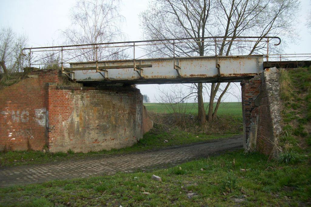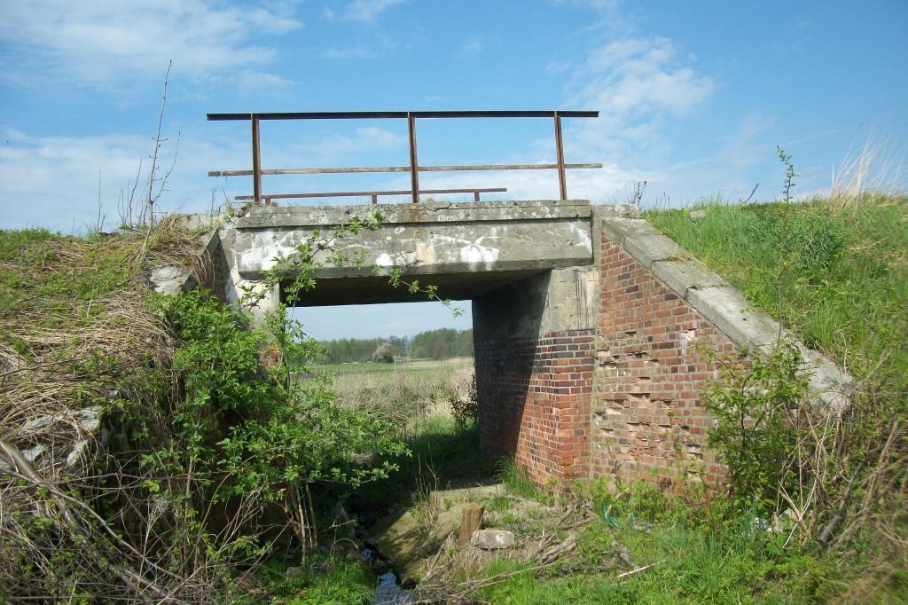 Mostek nad niewielkim strumykiem między stacjami Bukowa Śląska i Rychtal, około 1100 m przed stacją w Rychtalu.