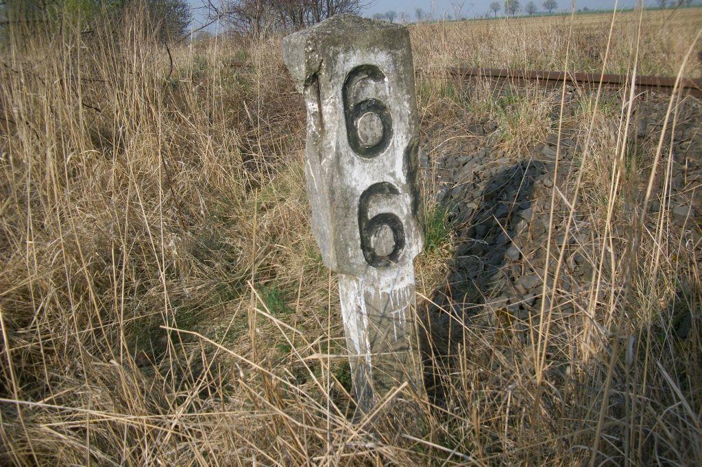 Słupek hektometryczny 6.6 między stacjami Kamienna Namysłowska i Bukowa Śląska.