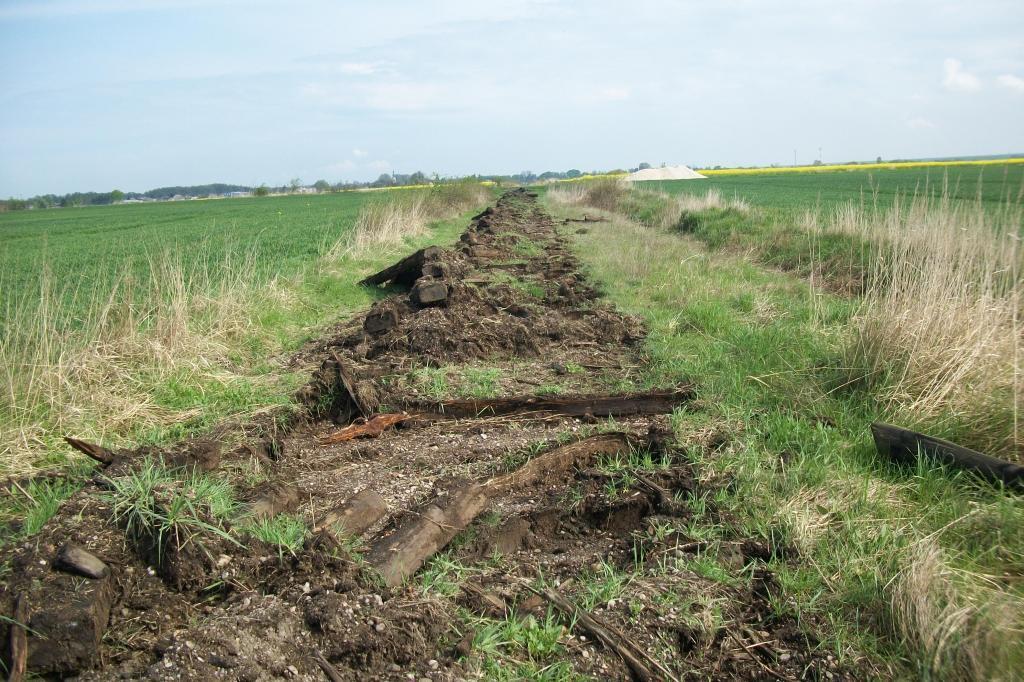 Torowisko między stacjami Rychtal i Buczek właśnie zostało pozbawione szyn i podkładów. Widok z szosy Darnowiec - Zgorzelec w stronę Rychtala.