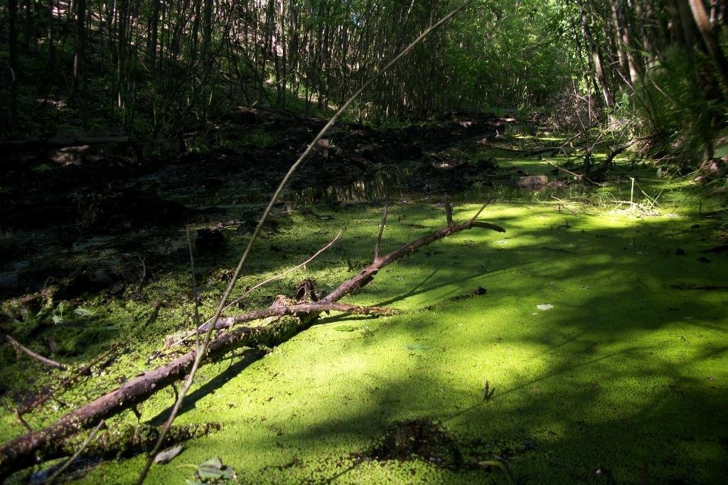 Biegnące w głębokim wykopie, zalane wodami gruntowymi, torowisko między stacjami Rychtal i Buczek - widok w stronę Namysłowa.