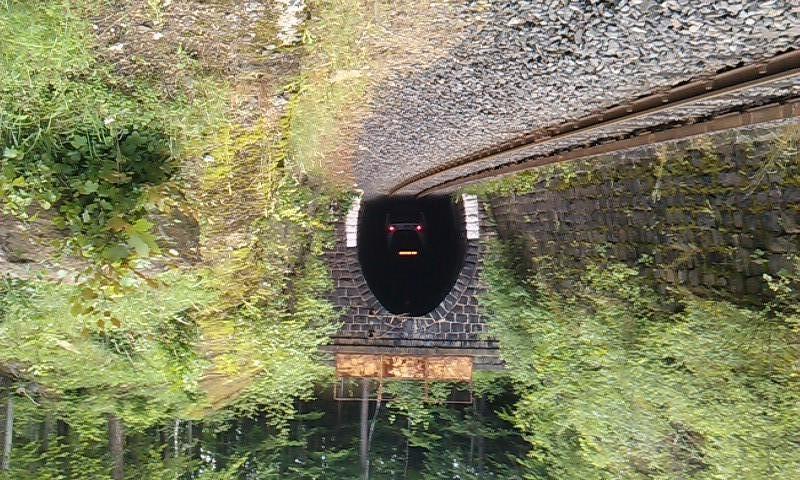 Tunel na szlaku Szklarska Poręba Dolna - Piechowice, w km 23 z pociągiem do Wrocławia. Wjazd od strony Szklarskiej Poręby, widok w kierunku północnym (Piechowice).