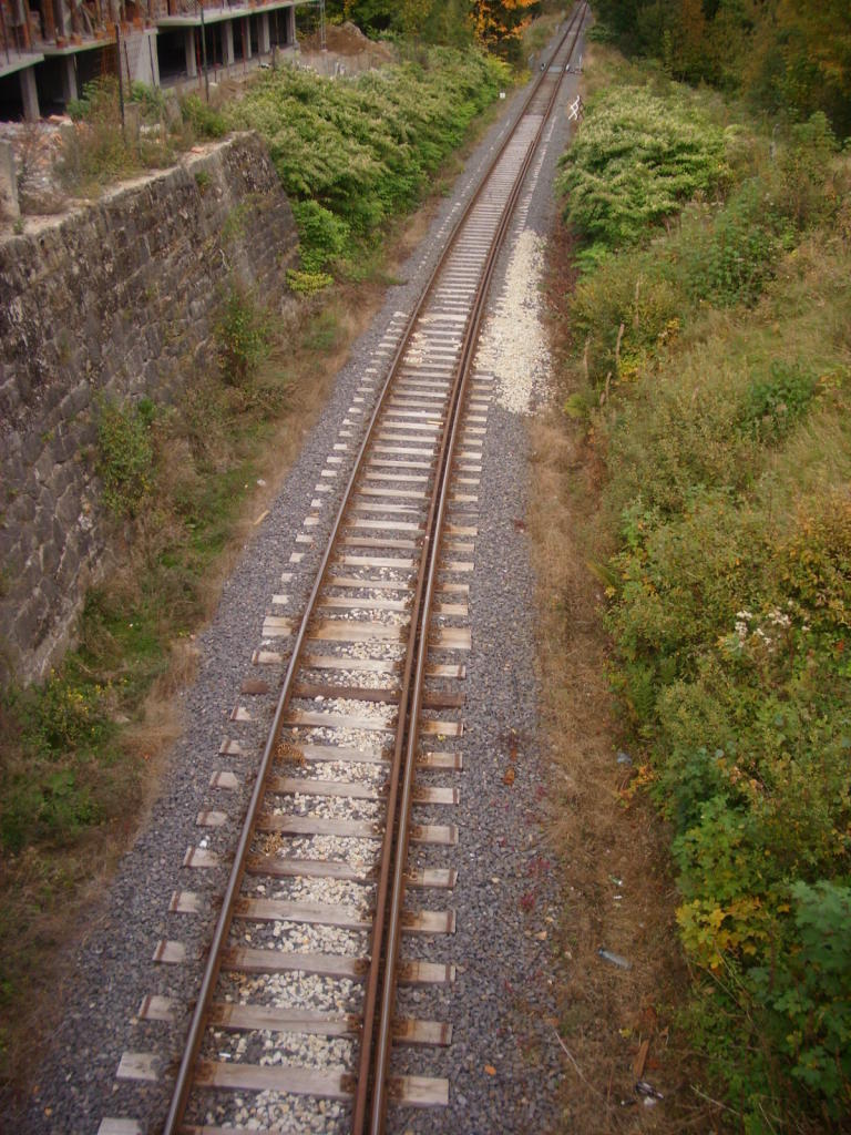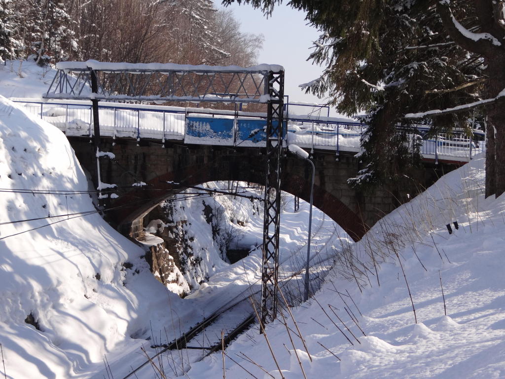 Wiadukt. Zachodnia głowica rozjazdowa; wyjazd na Jablonec nad Nisou. Wiadukt w ciągu ulicy Wolności. Widok w kierunku Jeleniej Góry. 28,9 km.