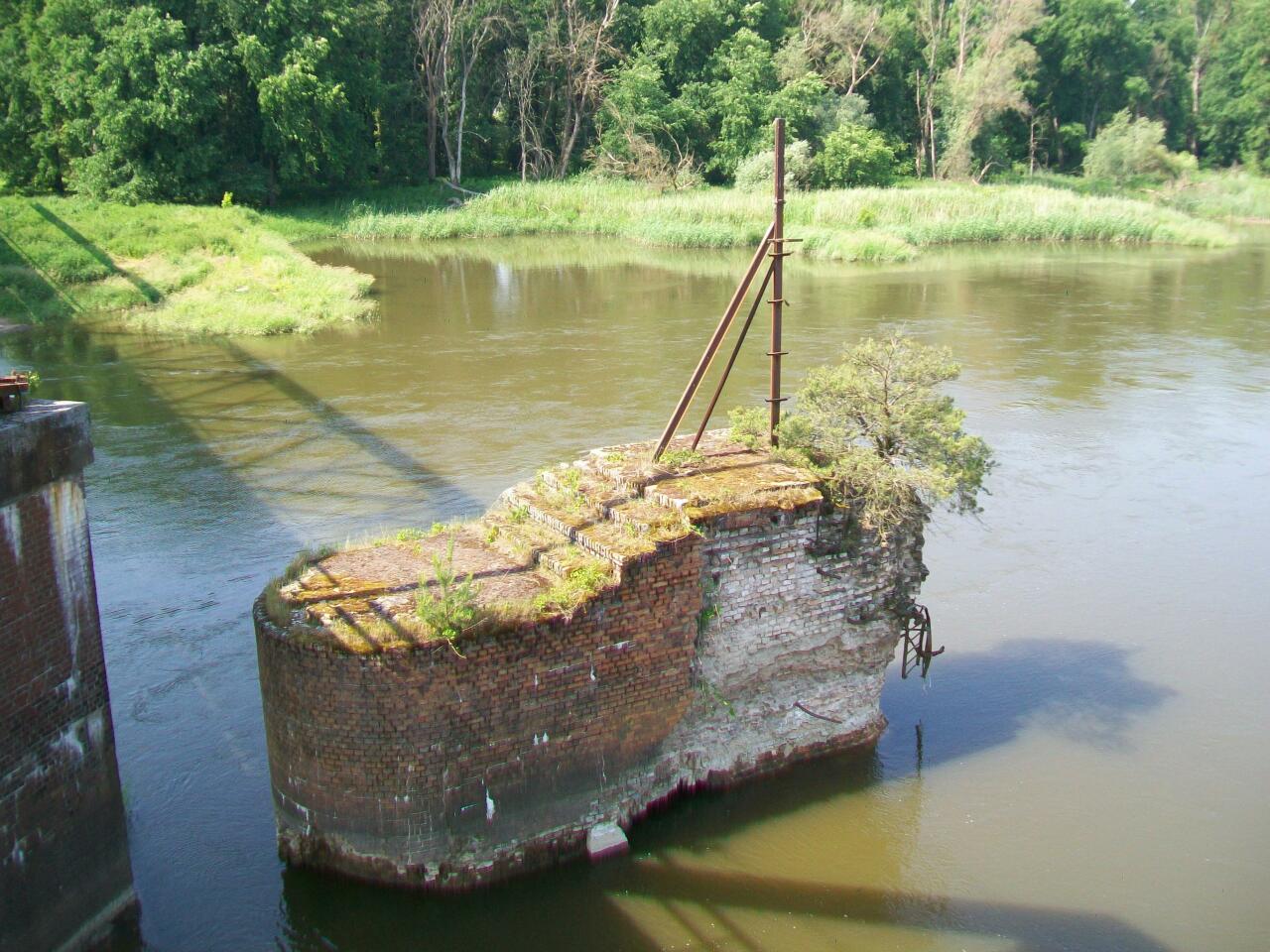 Fundament wyrastający z nurtu Odry, który najprawdopodobniej mieścił na sobie urządzenie do składania masztów (podobny wichajster był przy moście pod Siekierkami). Element umiejscowiony jest od strony ujścia Odry, opodal filara przęseł nurtowych.