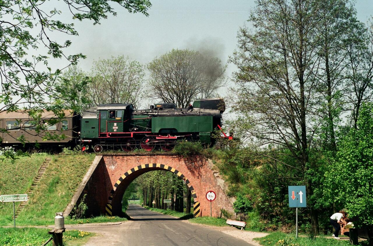 Pociąg specjalny z TKt48-87 na pożegnanie pary w Kępnie do Namysłaków jedzie torem jeszcze wzdłuż linii do Kluczborka.