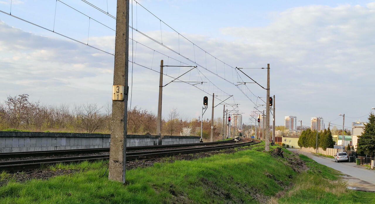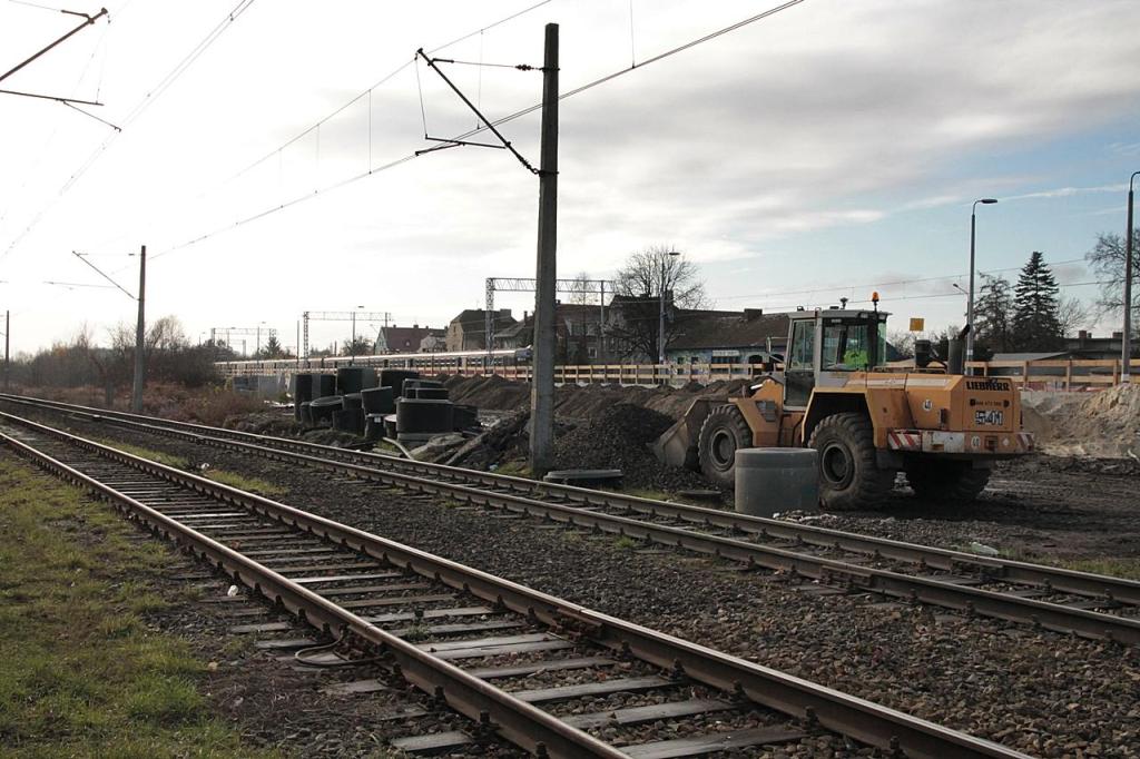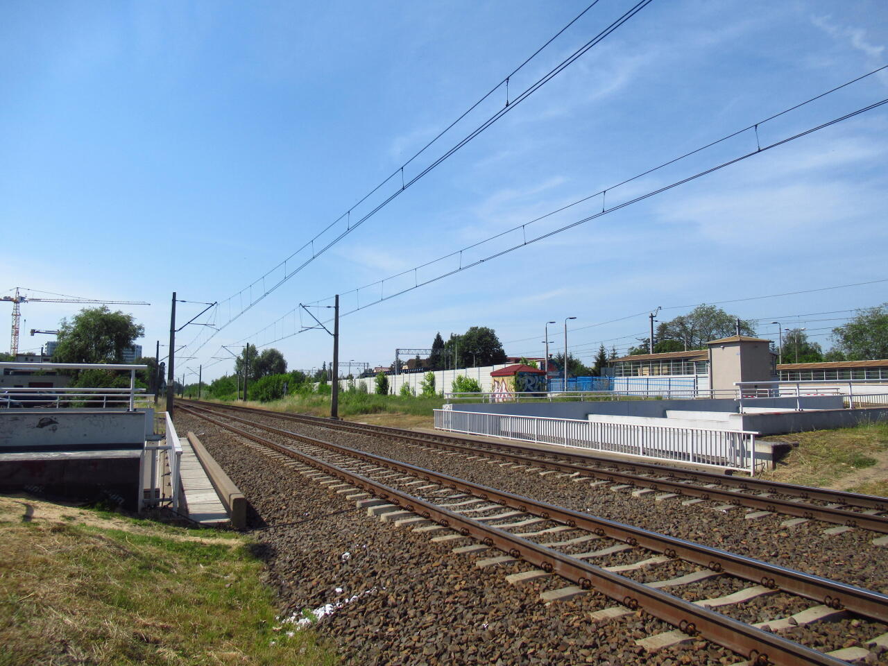 Widok z przejazdu ul. Czechosłowacka, tory kierunek PSK, po lewej modernizacja linii E 59 odcinek Czempiń - Poznań.