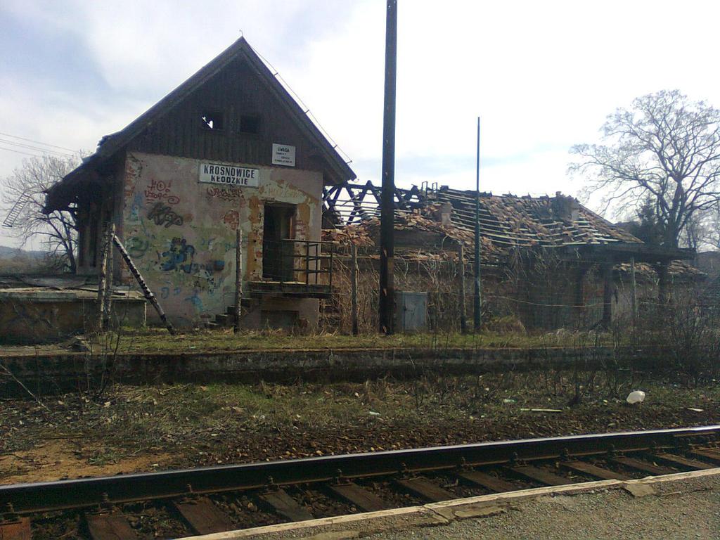 Przystanek w Krosnowicach, dawna stacja. Perony zachodnie (1 z lewej, 2, nieczynny, z prawej), obsługujące ruch po lk 276. Z prawej pozostałości zabudowań stacyjnych: dworca i nastawni. Widok w kierunku północnym (Kłodzko).
