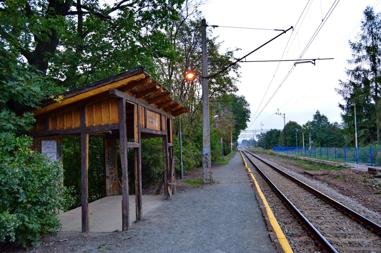 Krosnowice Kłodzkie. Zdewastowana wiata na peronie 1. Z prawej pozbawiony toru peron 2; zachodnia część dawnej stacji, obsługująca ruch na lk 276. Widok w kierunku północnym (Kłodzko).