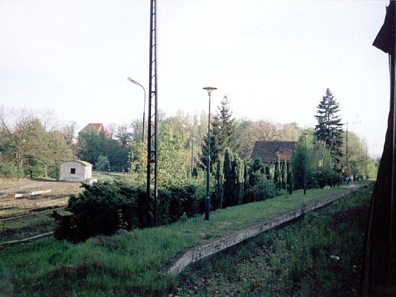 Widok na początek peronów od strony Kłodzka, na rozejściu się torów. Z prawej perony zachodnie, obsługujące ruch po lk 276, z lewej perony wschodnie, obsługujące ruch po lk 322. Pociąg stoi przy peronie 1, niewidocznym w kadrze (z prawej). Na pierwszym planie peron 2 z rozebranym torem peronowym. Po drugiej stronie żywopłotu peron 3, także pozbawiony toru i używany wtedy peron 4, wraz z niewielką grupą torów dodatkowych i magazynem towarowym, widocznym w tle. W klinie, pomiędzy peronami 2 i 3 widać zdewastowane budynki stacyjne: dworzec i nastawnię. Stacja już po zamknięciu w połowie lat 90. XX wieku i rozbiórce części układu torowego. Kierunek południowy.