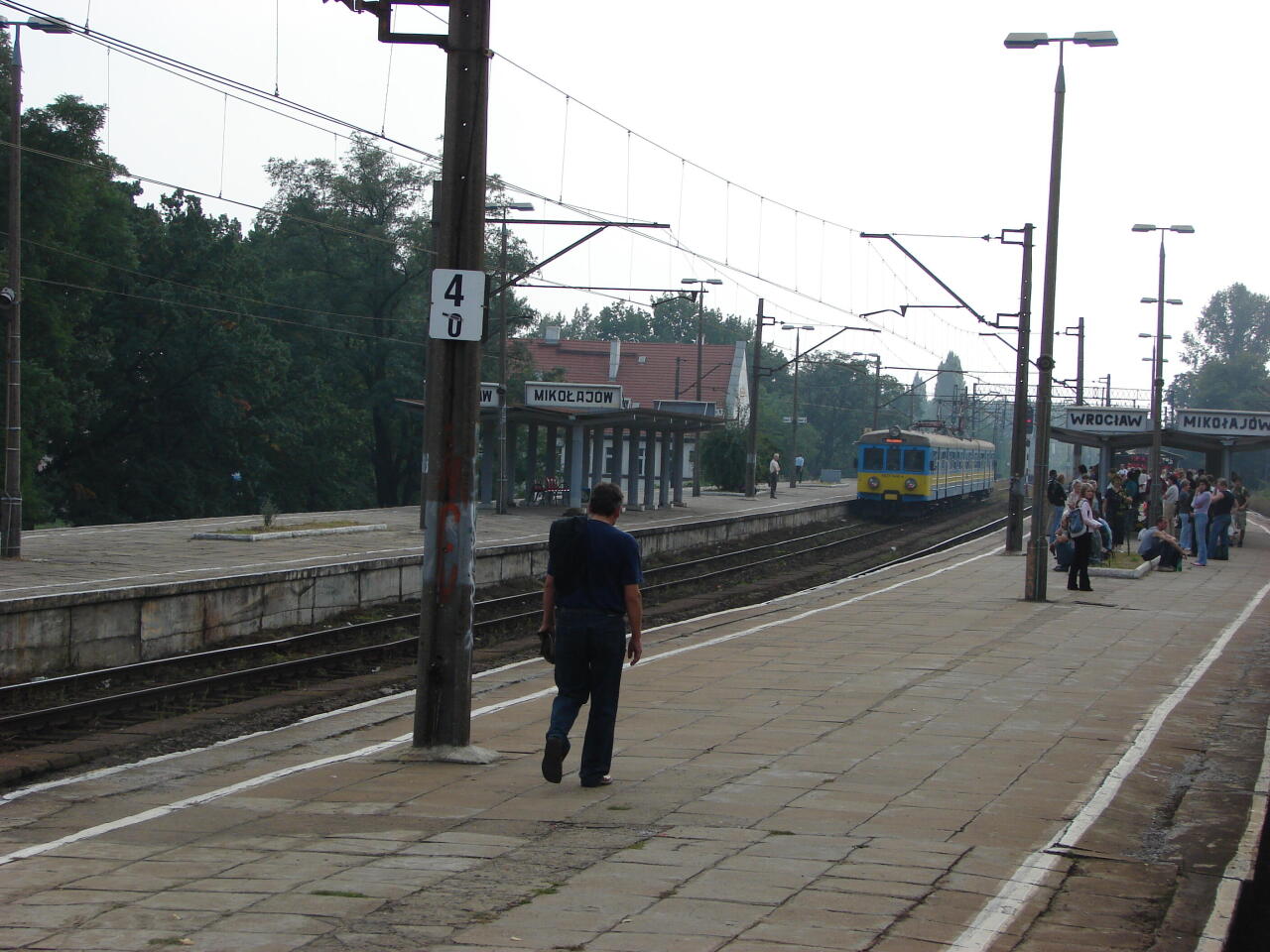 Wrocław Mikołajów, perony, po lewej pociąg z Rawicza (EN57–1131ra), po prawej do Poznania.