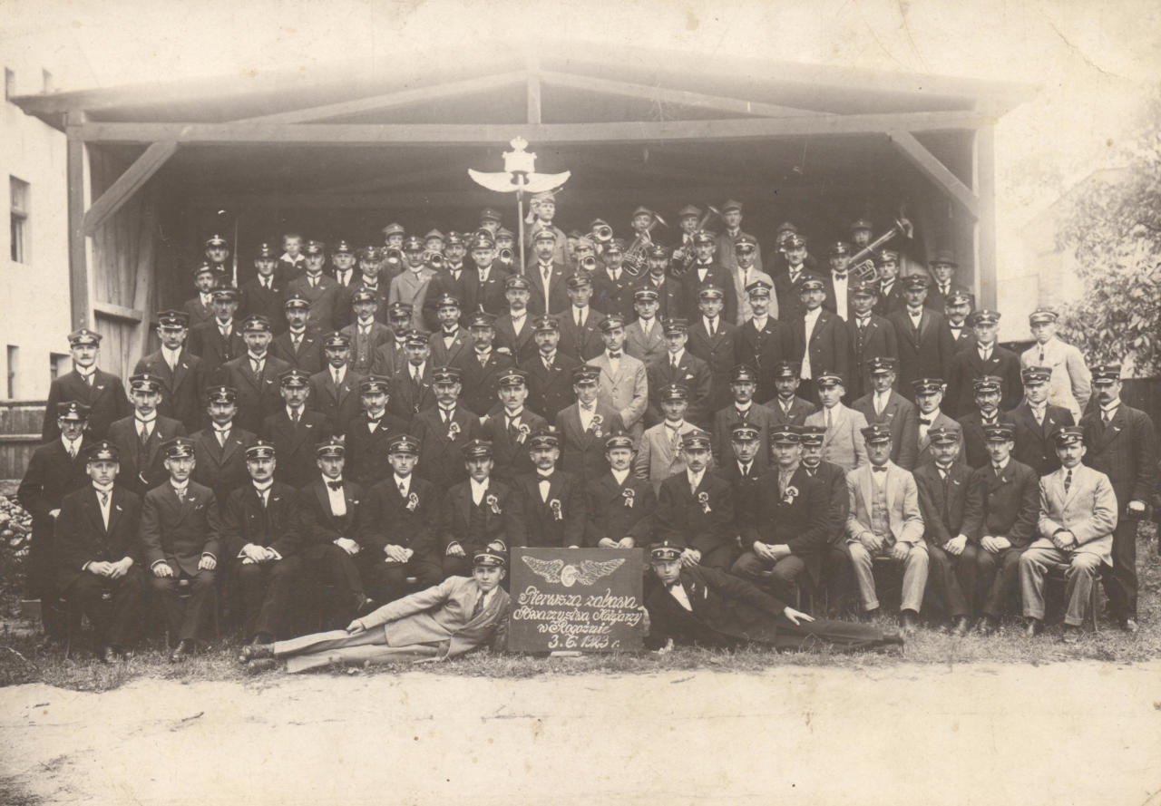 Pierwsza zabawa Towarzystwa Kolejarzy w Rogoźnie. Kopia fotografii uzyskana dzięki uprzejmości Haliny Marcinkowskiej. Prawa autorskie do fotografii zapewne wygasły.