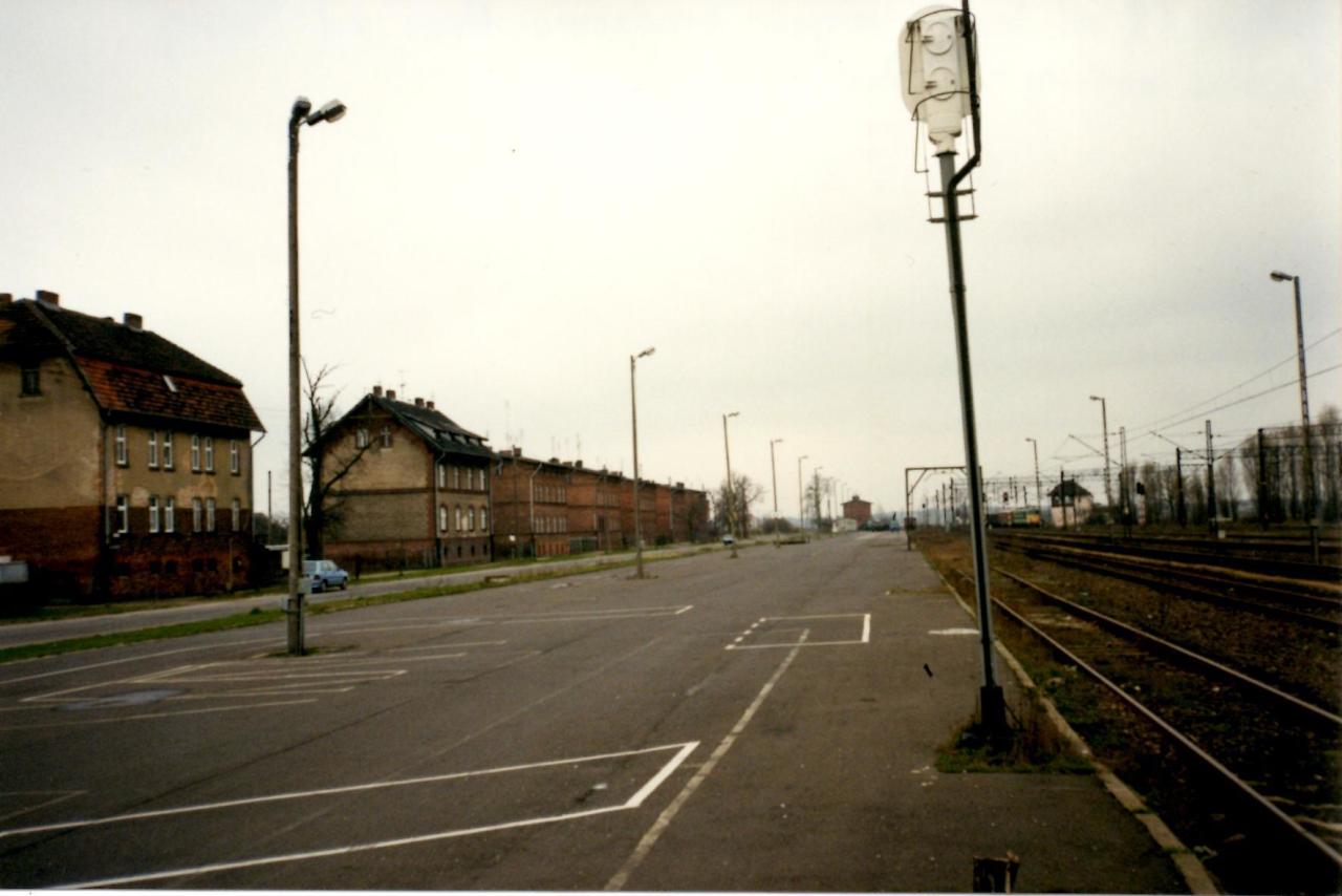 Plac przeładunkowy, z lewej kolejowe domy mieszkalne. Widok w kierunku południowym (Oborniki Wielkopolskie, Bzowo Goraj).