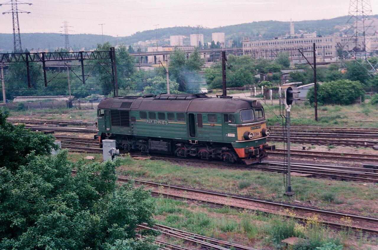 Stacja Gdynia Port GPC - lokomotywa ST44-1075 (MD Gdynia Grabówek) na manewrach stacyjnych, na dalszym planie Estakada Kwiatkowskiego, na prawo od estakady budynek zakładów "RADMOR". Zdjęcie wykonano z okna nastawni dysponującej GPC, w lewo - kierunek Gdynia Główna Osobowa (Nowa Wieś Wielka), posterunki P13, P15, w prawo - kierunek Gdynia Port GPF.