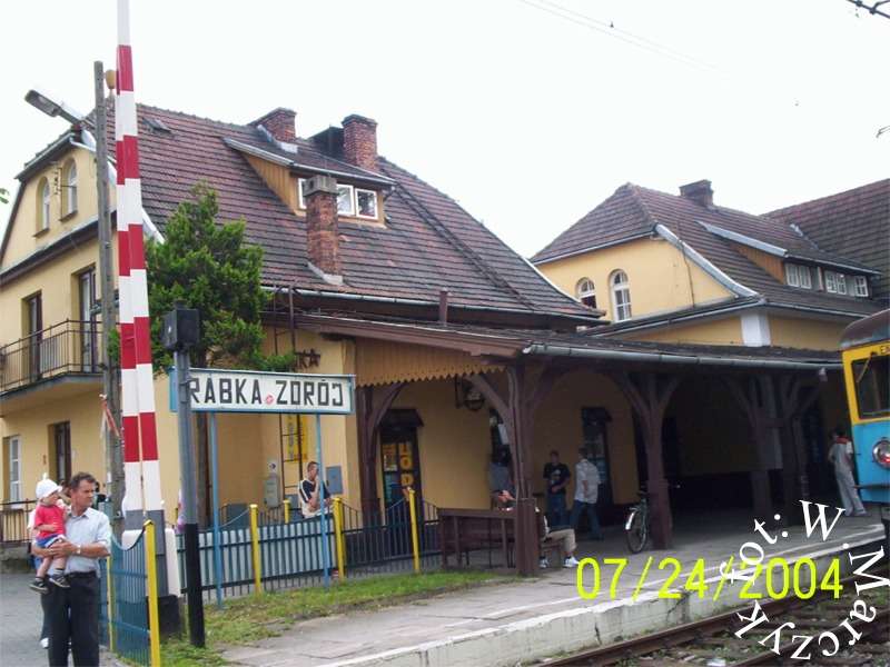 Opis ogólny: Linia Chabówka-Nowy Sącz jest zelektryfikowana tylko do Rabki (1 przystanek), a że Rabka to popularna miejscowość wypoczynkowa, to pociągi trakcji elektrycznej Kraków-Zakopane i odwrotnie, przejeżdżające przez Chabówkę, kierunek zmieniają nie tam, lecz zahaczają o Rabkę Zdrój. Czyli przystanek osobowy pełni częściowo rolę stacji. A jednak Rabka Zdrój wiele razy była stacją wg spisów lecz de facto po+ład (info: MK_MK, 28-09-2010) Opis infrastruktury: Stacja Rabka Zdrój Towarowa rozebrana, wiem, że jeszcze ok. 25 lat temu była. Został plac (obecnie stacja benzynowa) oraz rampa przeładunkowa (obecnie hurtownia). W pewnym oddaleniu od stacji jeden semafor wyjazdowy w stronę węzła Chabówka. Tory w dobrym stanie, zaraz za stacją w stronę Nowego Sącza zaczynają się słupy napowietrzne z telegrafem. (info: MK, 21-03-2008) Opis budynków: Budynek stacji osobowej w stanie dobrym lekko pomalowany przez grafficiarzy poza tym jest już nadgryziony zębem czasu. Czynne jedno lub dwa okienka z trzech (w zależności czy jest sezon czy nie). Poczekalnia czynna. W budynku znajduje się również gastronomia i fryzjer. Szalet na peronie niezdemolowany, od kilku lat zamknięty wisi kartka, że "do remontu". W 2008 położono nowy dach na budce dróżnika (obsługuje 4 przejazdy). Stacja towarowa, ze zmienionym przeznaczeniem, jest w niej hurtownia. (info: MK, 21-03-2008) 19 października 2010r - zamknięcie kasy i poczekalni. (info: MK_MK, 29-10-2010) Na stacji (zarówno wewnątrz dworca jak i na peronie) kręcony był film pod tytułem "Duże Zwierzę". (info: Bernard Piechota, 2007-07-26) |