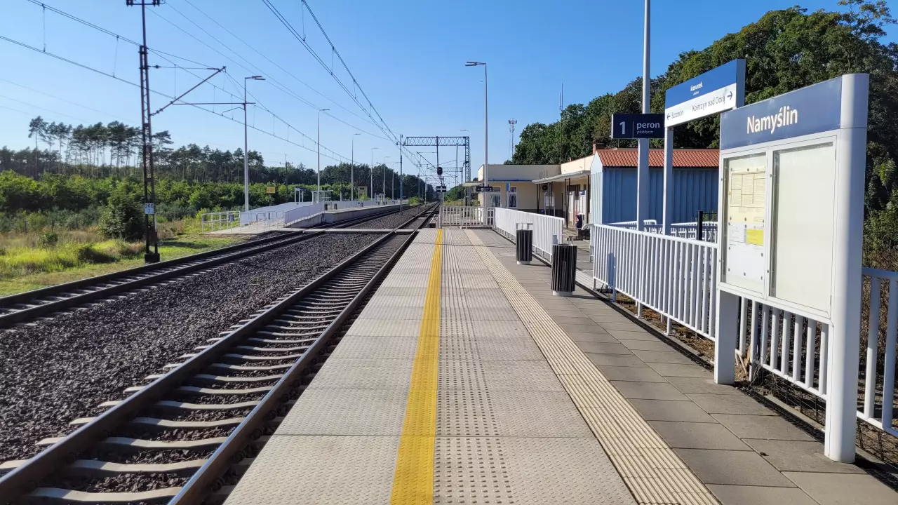 | Przejazd kolejowy na drodze Namyślin-Chwarszczany jest strzeżony opuszczanymi szlabanami. W okolicy dworca Namyślin jest też kilka nieczynnych już, nistrzeżonych przejść przez tory oraz chyba dwa czynne, niestrzeżone. W odległości 200-500 m w kierunku Szczecina, po lewej stronie torów stoi budynek, który zapewne miał przeznaczenie kolejowe, gdyż można na nim jeszcze odczytać zatarty napis Neumühl-Kutzdorf. Być może był to budynek związany z nieistniejącą już bocznicą kolejową do tartaku. (info: Maciej Michalski). |