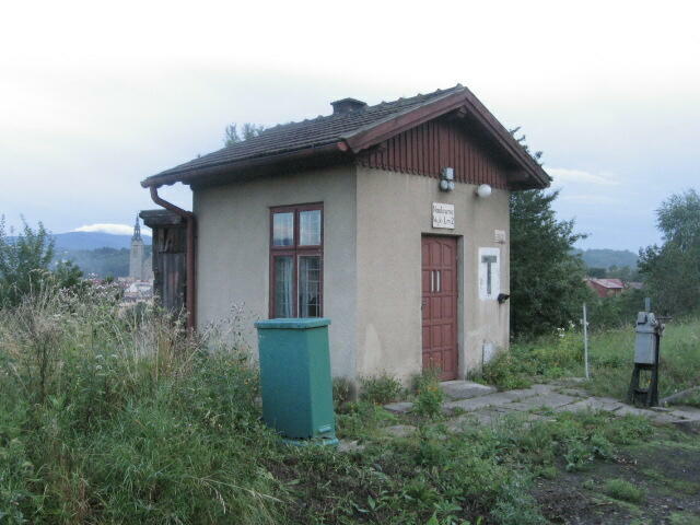Wyjazd ze stacji w stronę Pisarzowej. Po prawej stronie pozostałości po żurawiu wodnym.