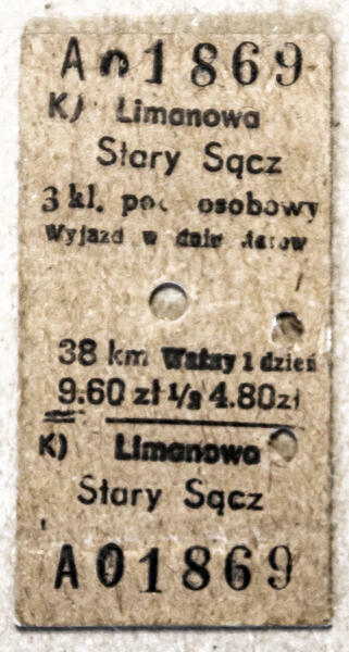 Popołudniowy pociąg osobowy z Nowego Sącza do Chabówki przy peronie stacji w Limanowej. Widok w kierunku południowo-wschodnim (Nowy Sącz).