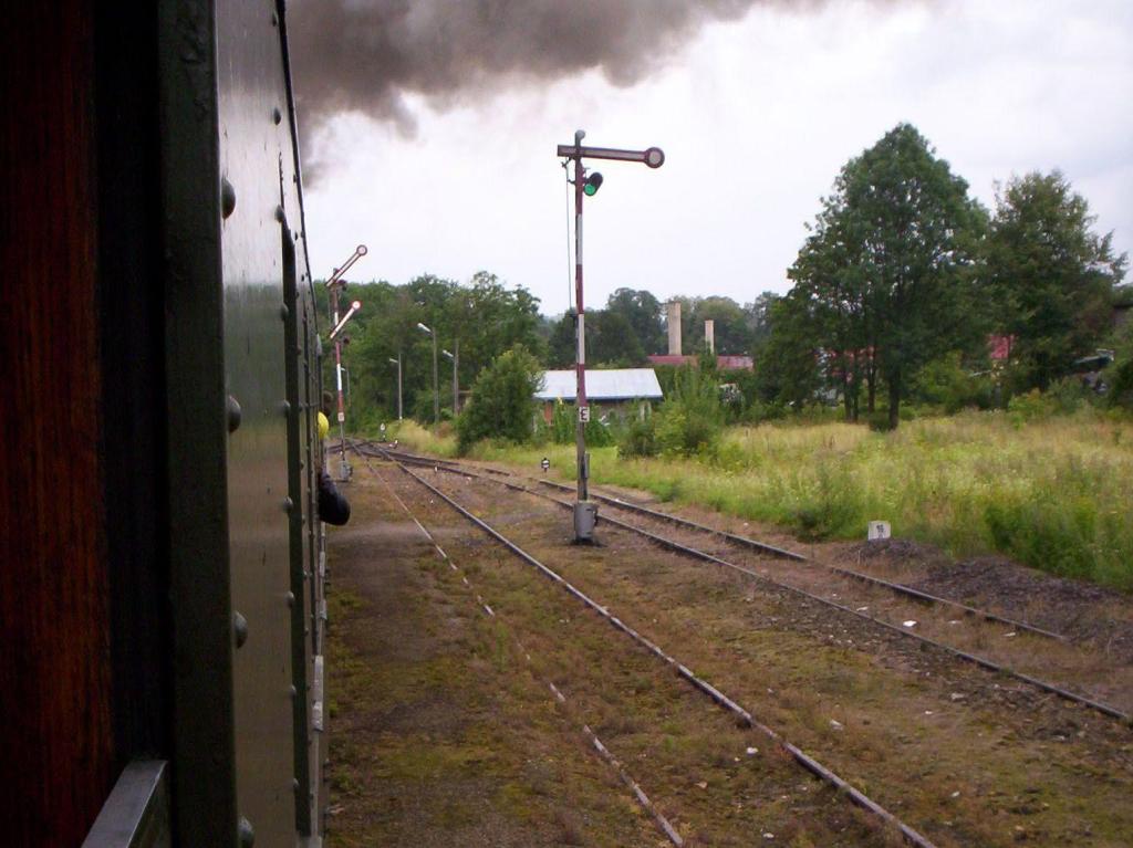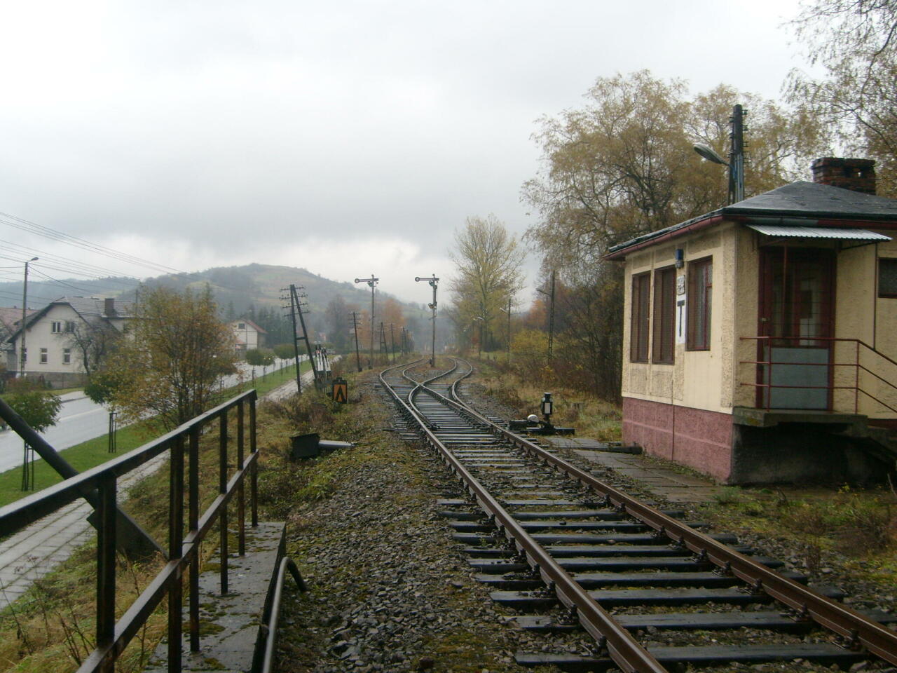 Wyjazd w stronę Nowego Sącza. Nietypowy widok, bo semafor podaje sygnał "wolna droga ze zmniejszoną szybkością". W tamtym czasie najczęściej pociągi wyjeżdżały ze stacji "na wprost". Sytuacja spowodowana dużym nagromadzeniem taboru na stacji. Pociąg do Nowego Sącza, z którego zrobione jest zdjęcie kilka godzin wcześniej uderzył w samochód osobowy na przejeździe kolejowym w Rabie Niżnej (droga do obecnego Domu Pomocy Społecznej).