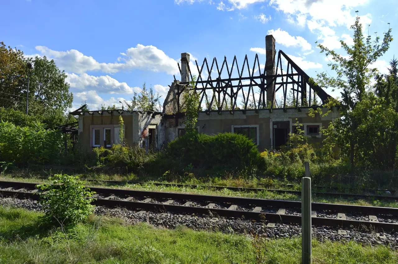 Postępująca degradacja dawnego budynku dworcowego po pożarze w roku 2021. Budynek jest całkowicie opuszczony i zdewastowany, wala się sporo zniszczonego, porzuconego mienia.